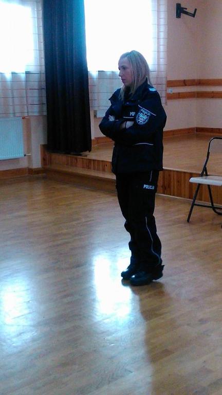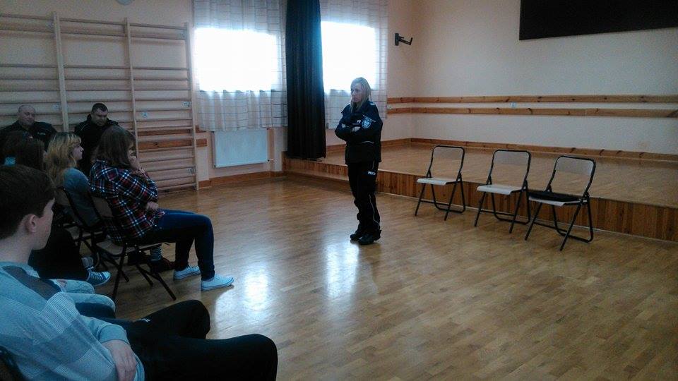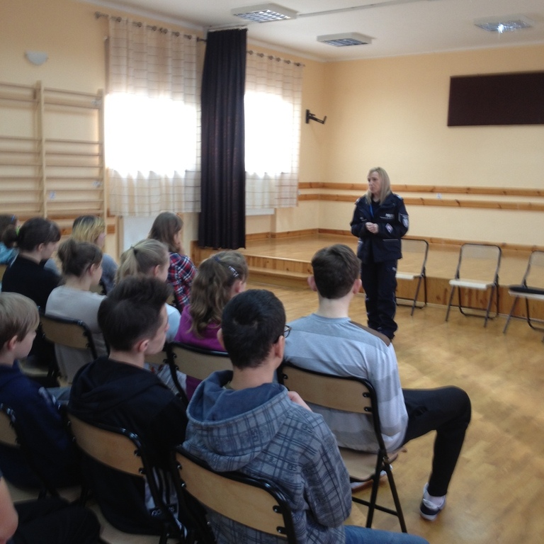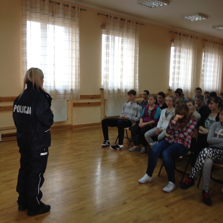 W bardzo obrazowy i konkretny sposób pani policjantka uświadomiła młodzież gimnazjalną o grożących im niebezpieczeństwach związanych