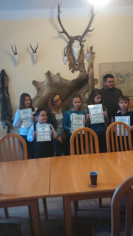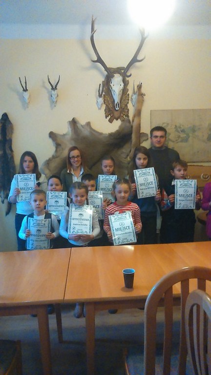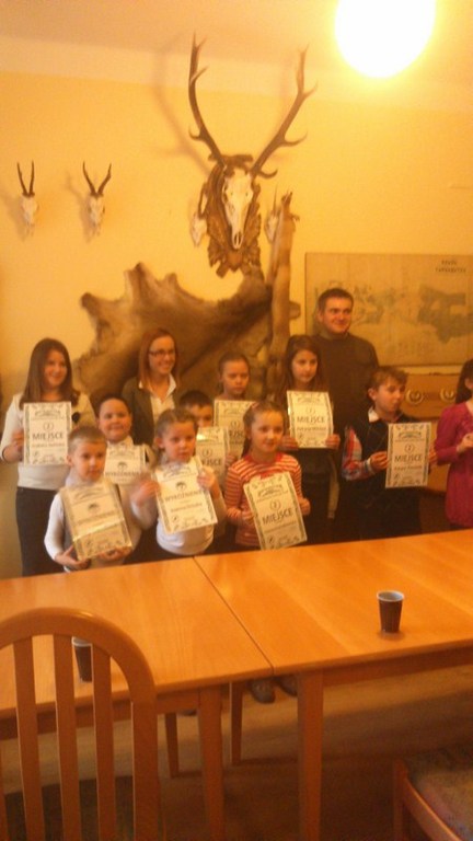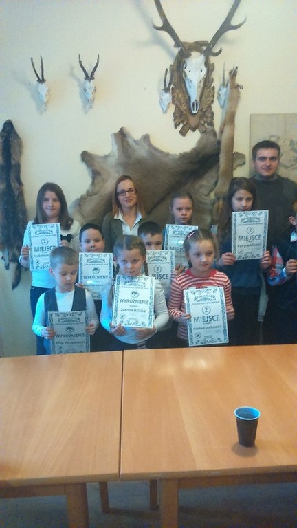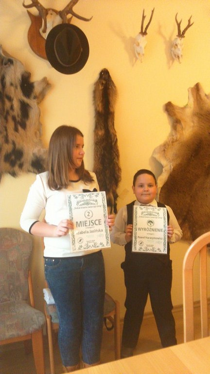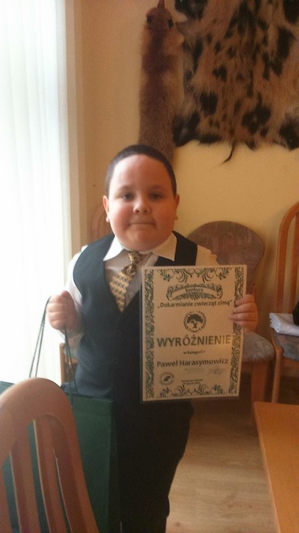 W dniu 29 stycznia 2015r. uczniowie naszej szkoły: Izabela Jasińska (klasa V) i Paweł Harasymowicz (klasa II) uczestniczyli w uroczystym podsumowaniu konkursu plastycznego " Dokarmiamy zwierzęta w zimie". Spotkanie odbyło się w siedzibie Nadleśnictwa w Tomaszowie Lub. Na konkurs wpłynęło ponad 300 prac konkursowych. Prace wymienionych uczniów zostały wyróżnione, a uczniowie otrzymali dyplomy i cenne nagrody. Natomiast wszyscy uczestnicy konkursu dostali od organizatora odblaskowe znaczki. Paweł i Izabela pojechali na uroczystość ze swoimi mamami.
