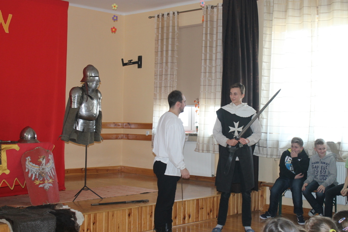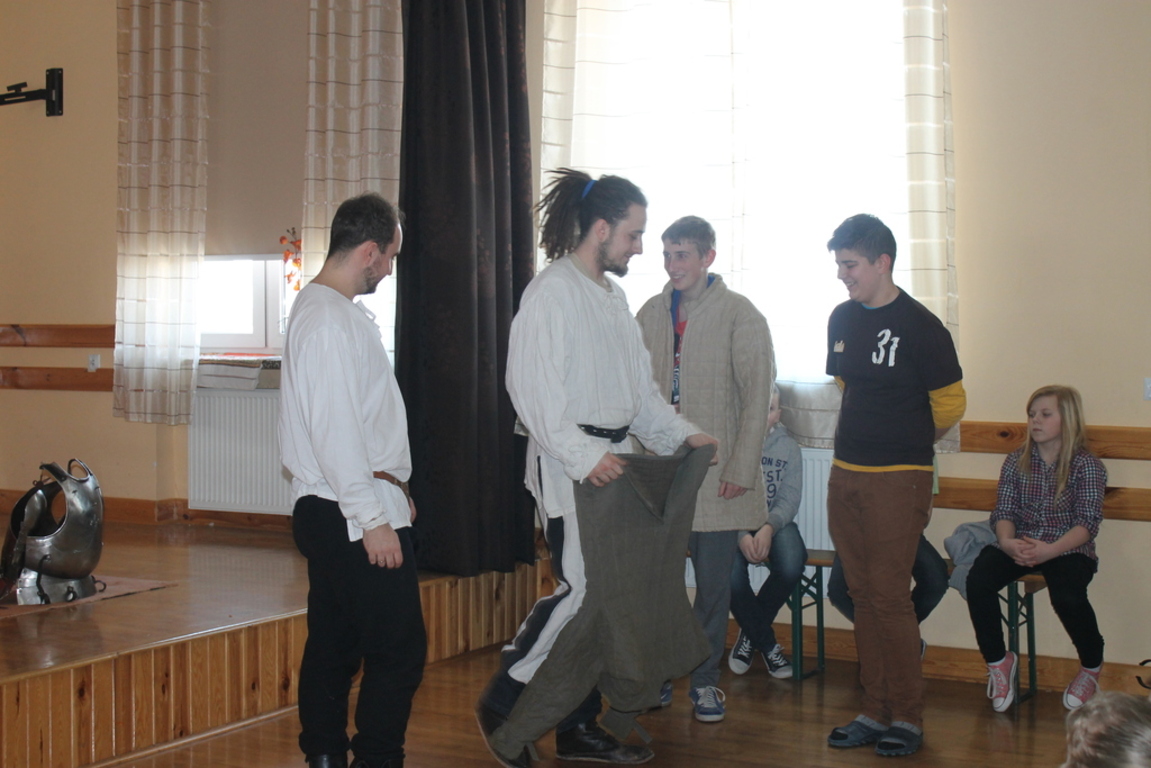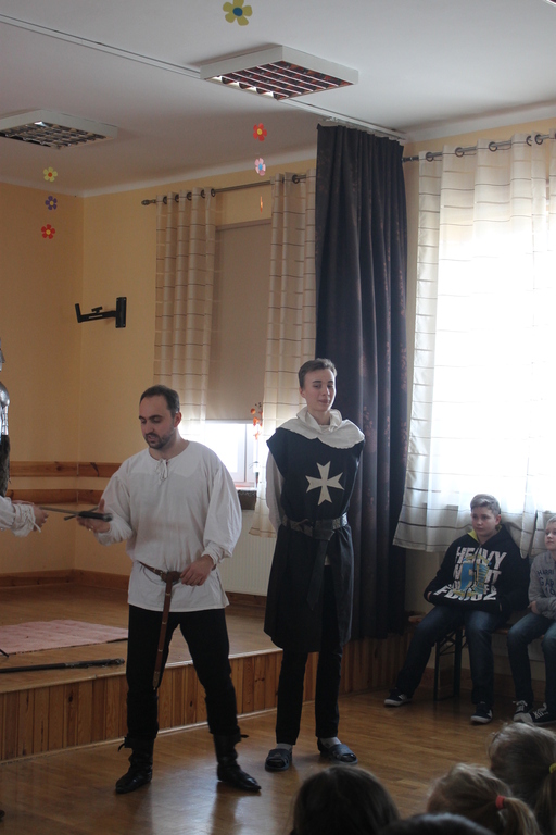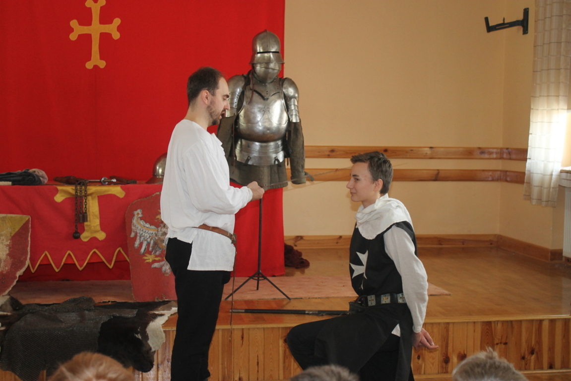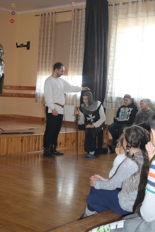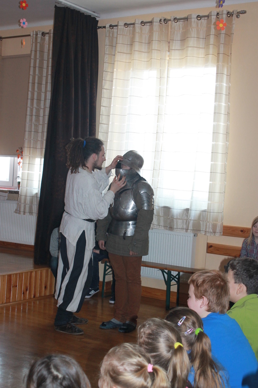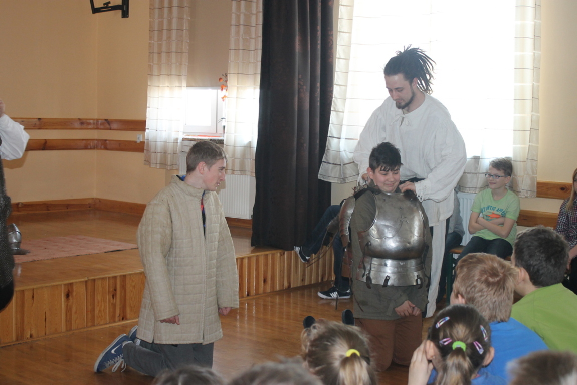 Mogliśmy zaznajomić się z obrzędem pasowania na rycerza oraz z tym, co należało do obowiązków giermka. Posłuchaliśmy jak wyglądała droga wiodąca młodzieńca od pazia do rycerza, poznaliśmy zasady kodeksu rycerskiego. Z zainteresowaniem obejrzeliśmy widowiskowy pojedynek pomiędzy rycerzem z zakonu Joannitów a Krzyżakiem i wysłuchaliśmy opowieści dotyczącej bitwy grunwaldzkiej. Wybrani chłopcy zostali odziani w zbroje rycerskie, zaś uczennica gimnazjum zaprezentowała strój kobiecy.