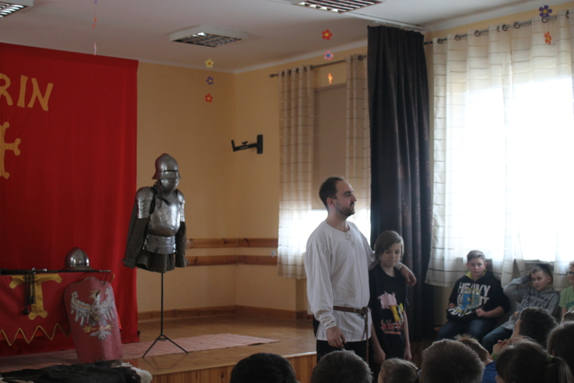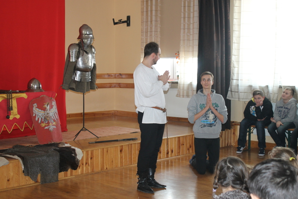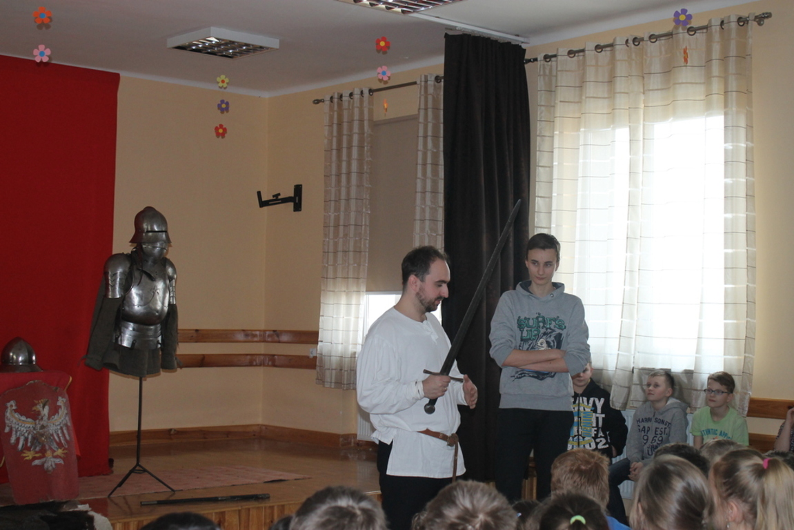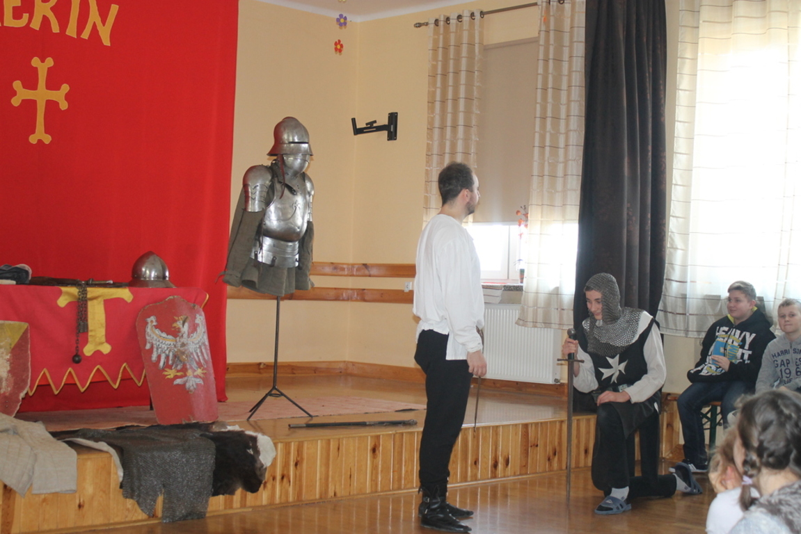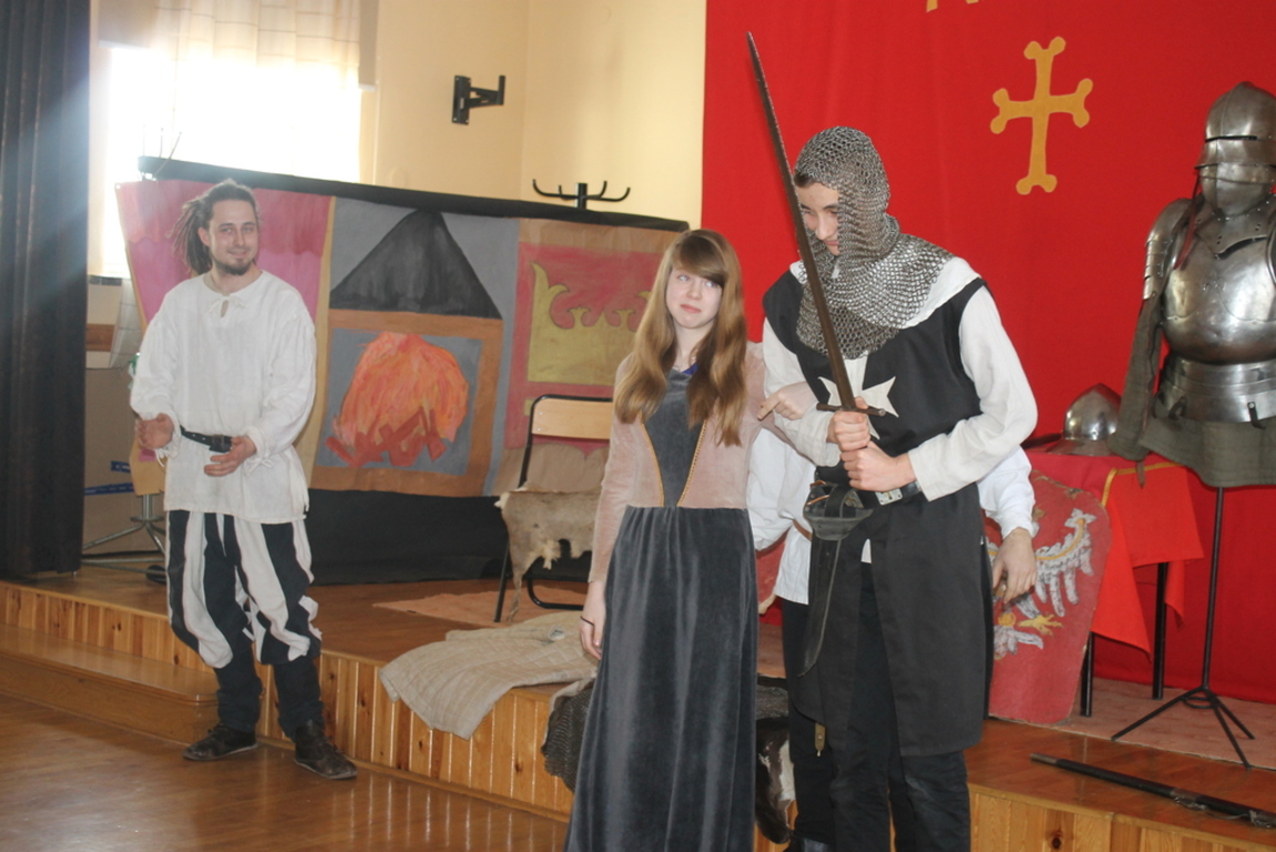 Mogliśmy zaznajomić się z obrzędem pasowania na rycerza oraz z tym, co należało do obowiązków giermka. Posłuchaliśmy jak wyglądała droga wiodąca młodzieńca od pazia do rycerza, poznaliśmy zasady kodeksu rycerskiego. Z zainteresowaniem obejrzeliśmy widowiskowy pojedynek pomiędzy rycerzem z zakonu Joannitów a Krzyżakiem i wysłuchaliśmy opowieści dotyczącej bitwy grunwaldzkiej. Wybrani chłopcy zostali odziani w zbroje rycerskie, zaś uczennica gimnazjum zaprezentowała strój kobiecy.