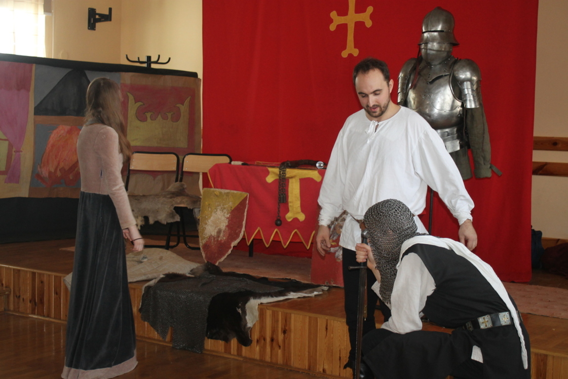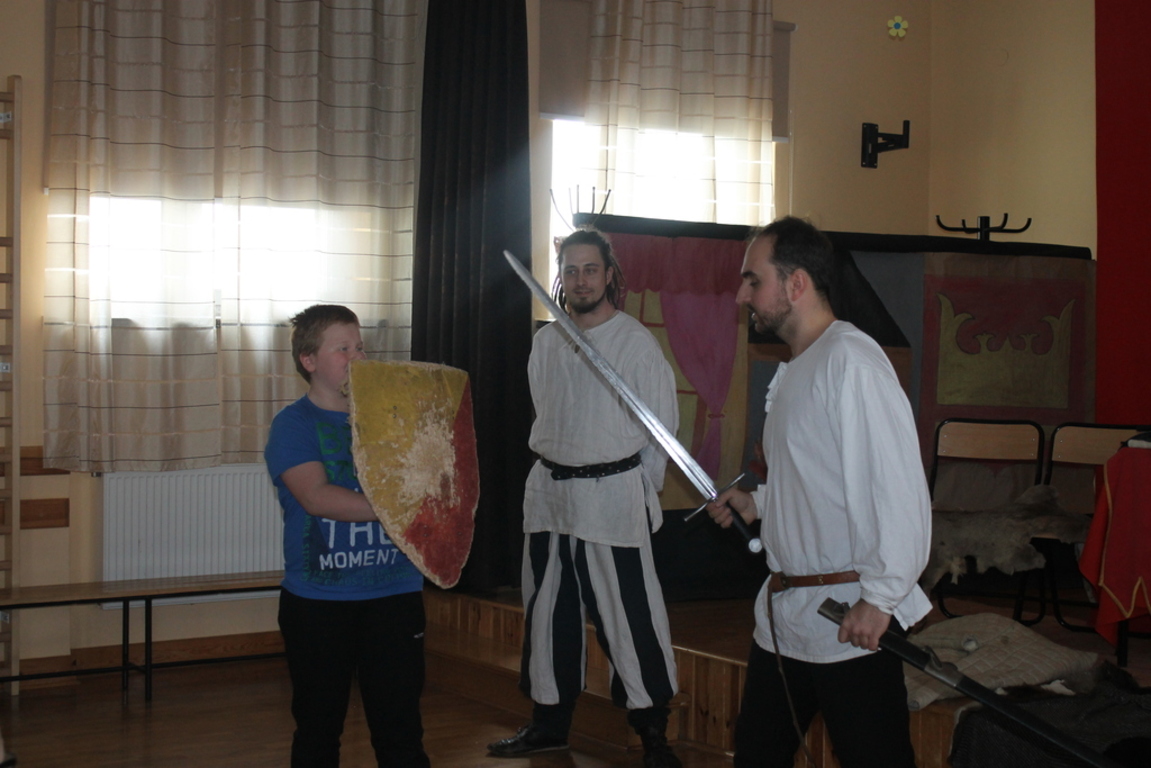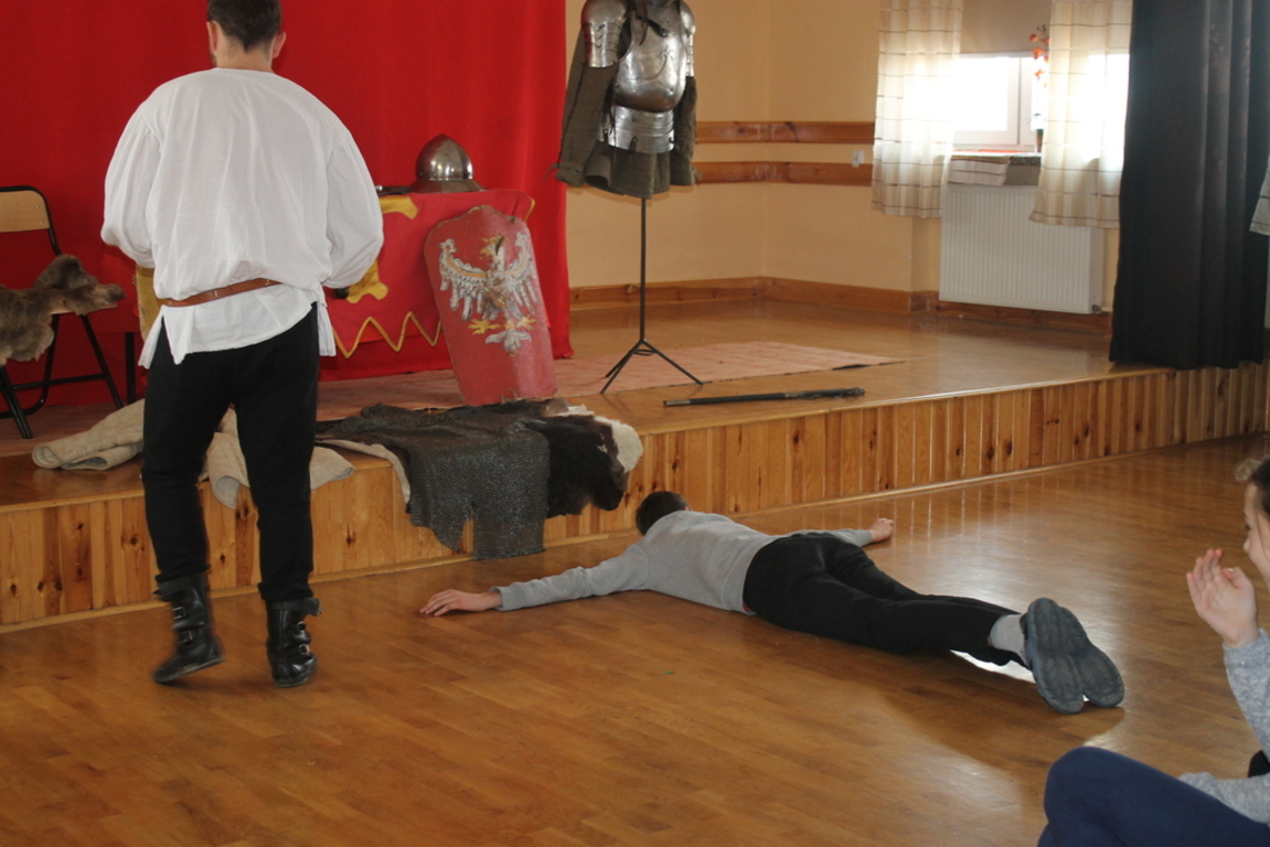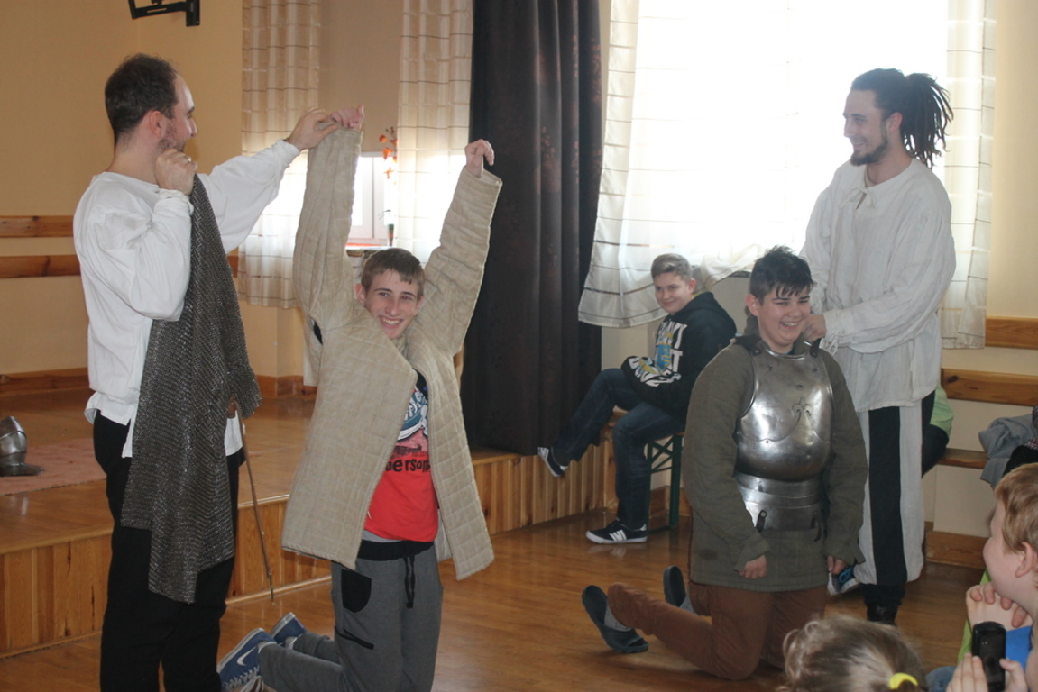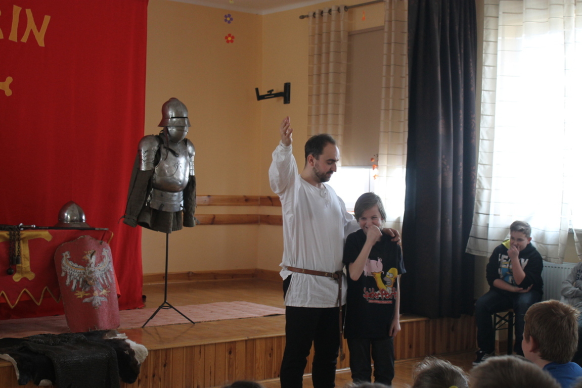 Mogliśmy zaznajomić się z obrzędem pasowania na rycerza oraz z tym, co należało do obowiązków giermka. Posłuchaliśmy jak wyglądała droga wiodąca młodzieńca od pazia do rycerza, poznaliśmy zasady kodeksu rycerskiego. Z zainteresowaniem obejrzeliśmy widowiskowy pojedynek pomiędzy rycerzem z zakonu Joannitów a Krzyżakiem i wysłuchaliśmy opowieści dotyczącej bitwy grunwaldzkiej. Wybrani chłopcy zostali odziani w zbroje rycerskie, zaś uczennica gimnazjum zaprezentowała strój kobiecy.
