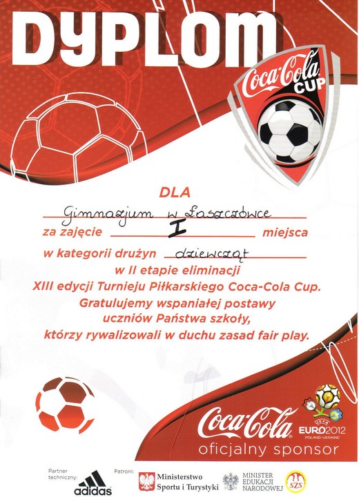 W II etapie XIII edycji Turnieju Piłkarskiego Coca-Cola Cup w kategorii dziewcząt, reprezentacja naszej szkoły zajęła I miejsce i zapewniła sobie udział w finale wojewódzkim, który odbędzie się w Krasnymstawie 2 czerwca 2011r. W pierwszym dzisiejszym meczu drużyna nasza pokonała Gimnazjum Krynice 6:2,(bramki: Martyna Byra 2, Weronika Pyzik 2, Katarzyna Soluch 1, Magda Pisarczyk 1), w drugim meczu padł wynik remisowy 1:1 z drużyną Gimnazjum z Łaszczowa (bramkę zdobyła Anna Dumicz) . Awans zapewniły sobie: Magda Krawczyk, Katarzyna Soluch, Martyna Byra, Amelia Babiarz, Magda Przednowek, Kamila Nagowska, Magda Pisarczyk, Ania Dumicz, Justyna Drożdż, Weronika Pyzik. Drużynę prowadził - Paweł Przytuła.