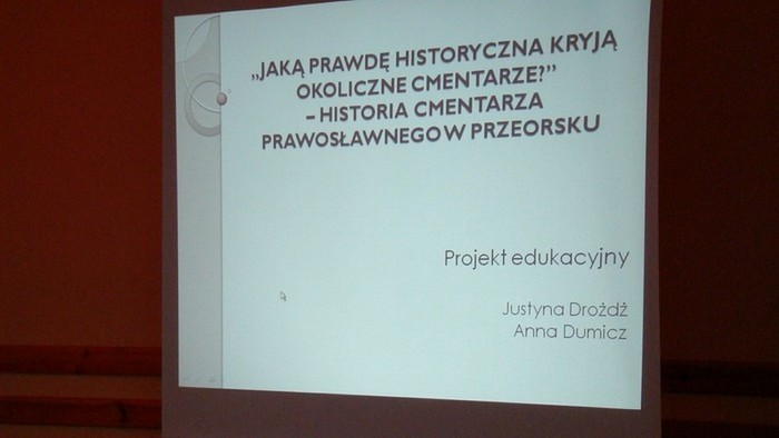 30 maja 2012 odbyła się w naszej szkole publiczna prezentacja projektu edukacyjnego z historii pt. „ Jakie prawdy historyczne kryją okoliczne cmentarze?”. Uczestniczki projektu zaprezentowały przed klasami gimnazjalnymi prezentacje multimedialne dotyczące realizowanego tematu.