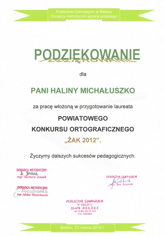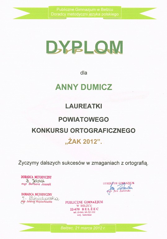 31 maja w Publicznym Gimnazjum w Bełżcu odbyło się wręczenie nagród laureatom konkursu ortograficznego ,,Żak 2012”.