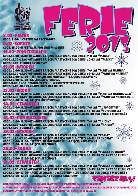 Wszystkich, którzy w czasie ferii się nudzą .....zapraszamy do szkoły. W załączniku harmonogram zajęć.