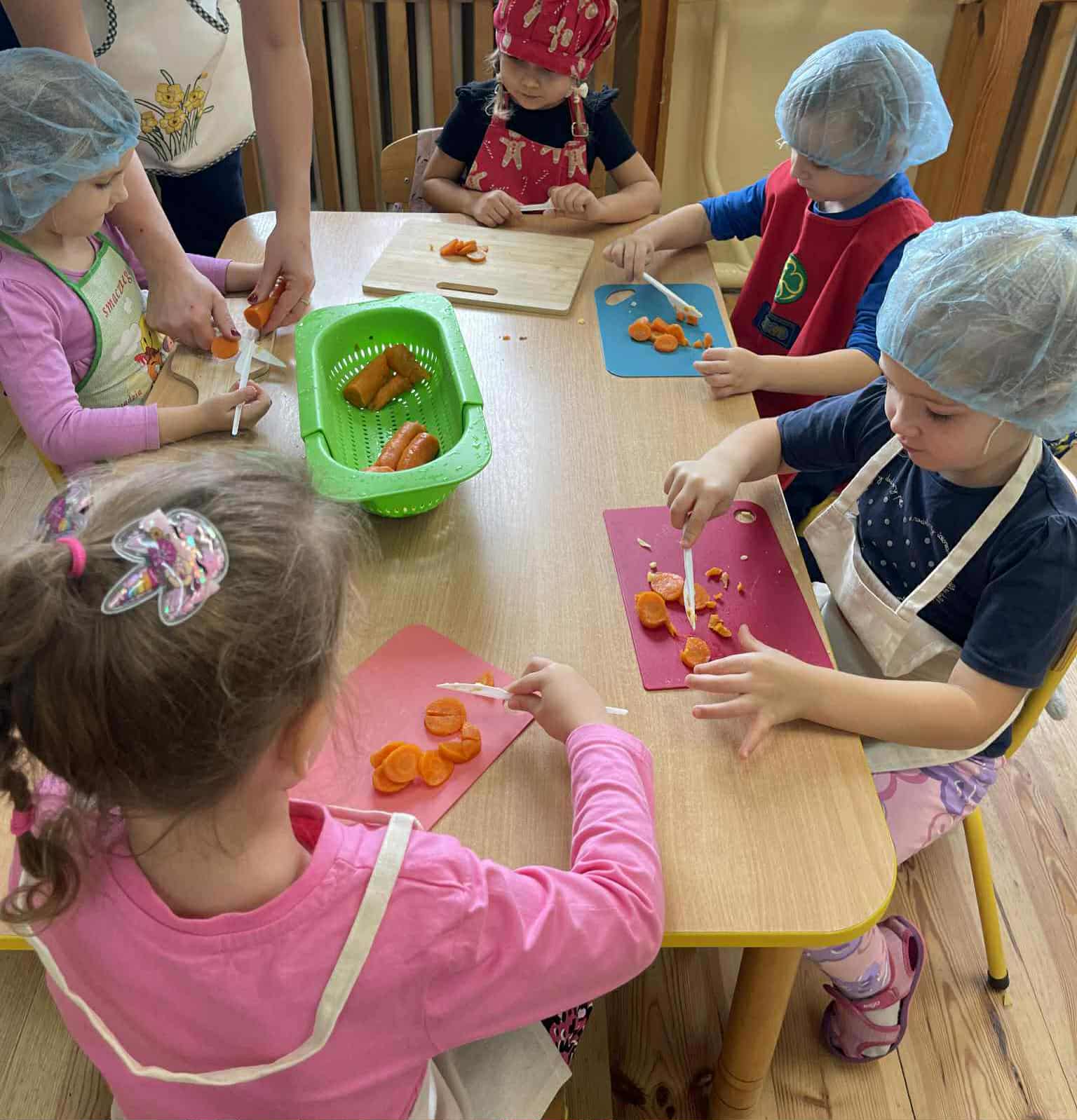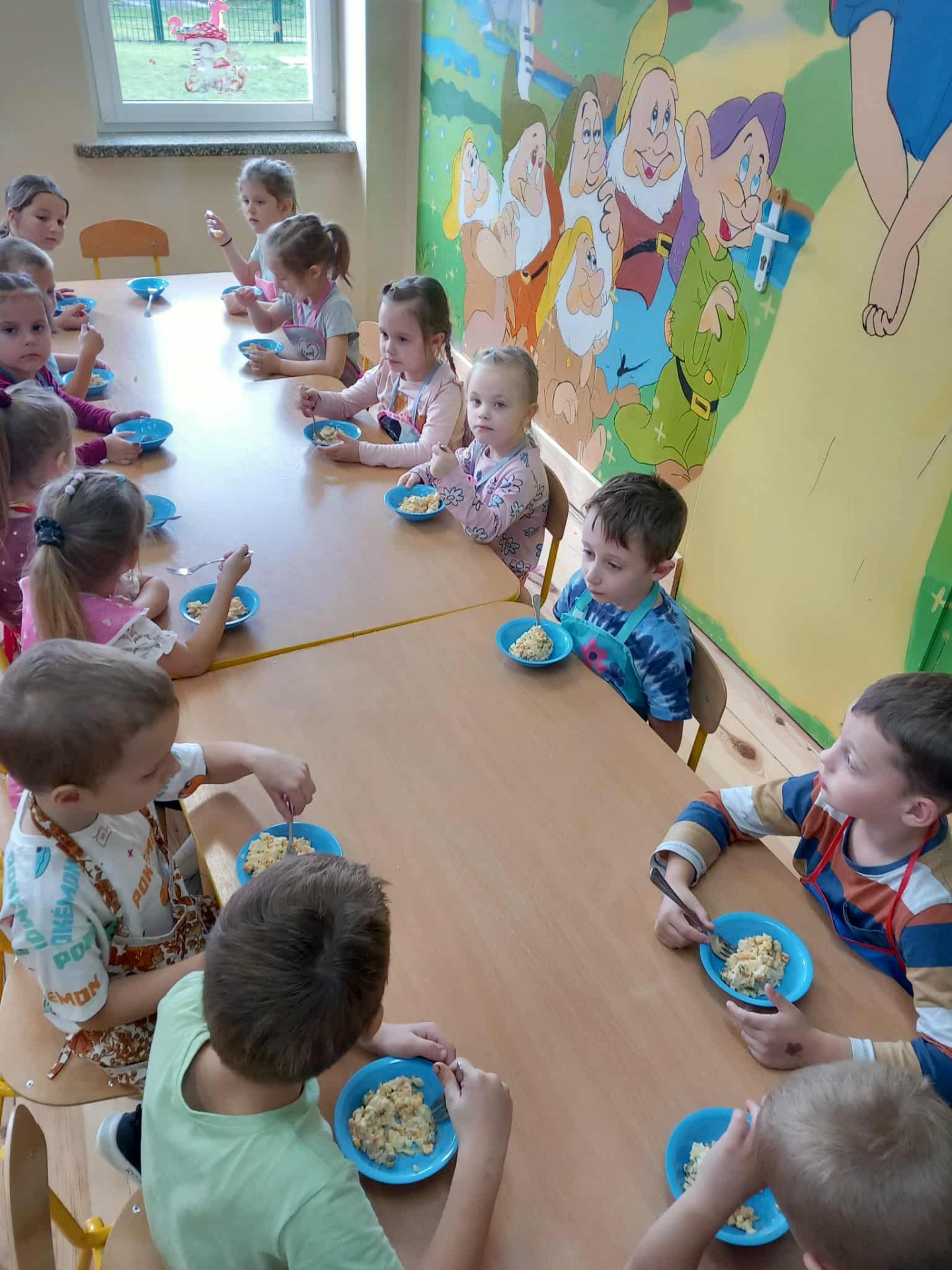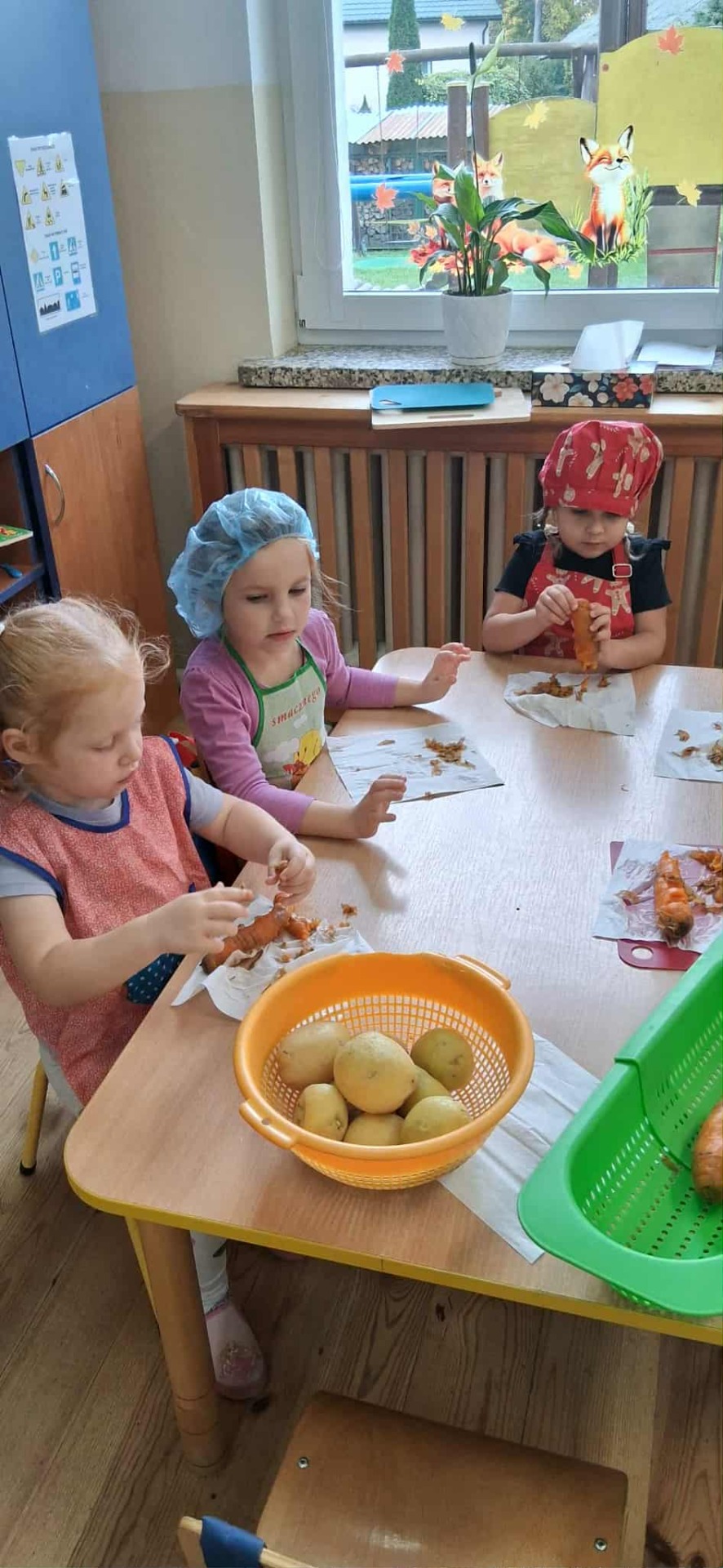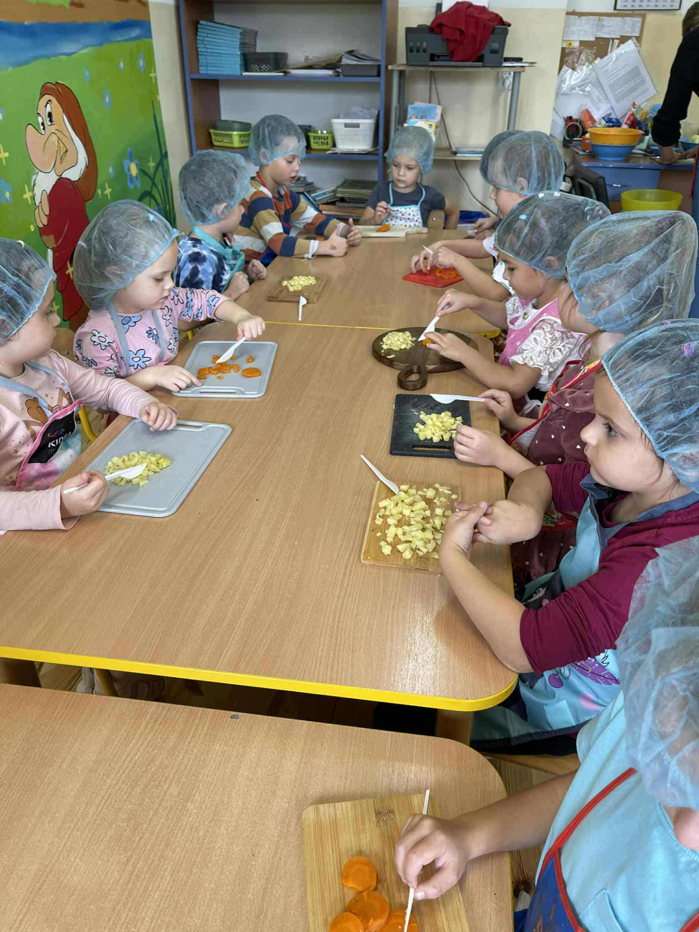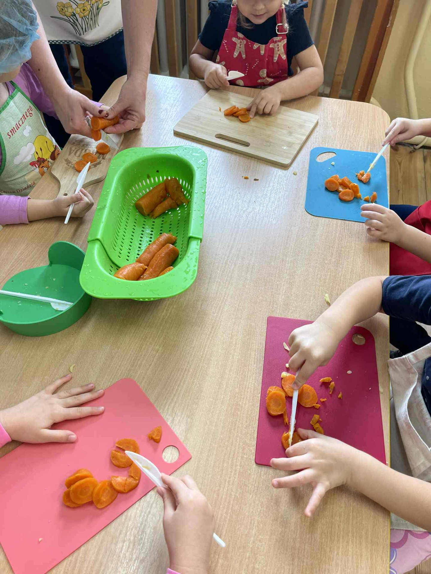 16.10.2025r. w nawiązaniu do zajęć o zdrowym odżywianiu, zrobiliśmy sałatkę jarzynową. Podczas krojenia marchewek, ziemniaków, ogórków i innych warzyw zachowaliśmy podstawowe zasady higieny i bezpieczeństwa. Ubrani w kolorowe fartuszki samodzielnie obraliśmy i starannie pokroiliśmy składniki. Gdy sałatka była gotowa, wspólnie usiedliśmy do drugiego śniadania. Świetnie się bawiliśmy, a jeszcze lepiej najedliśmy.