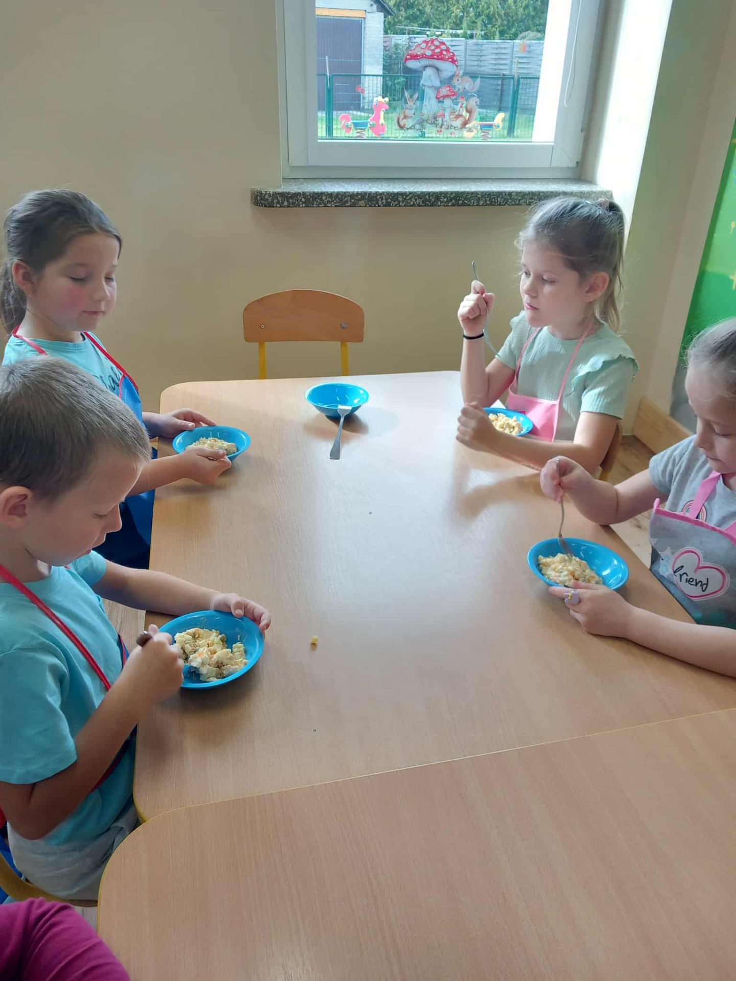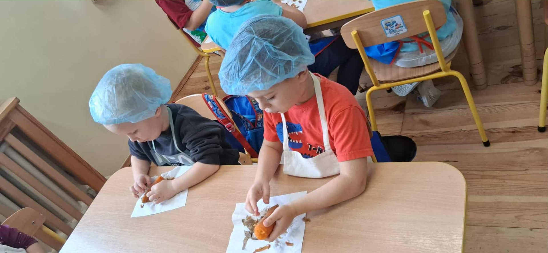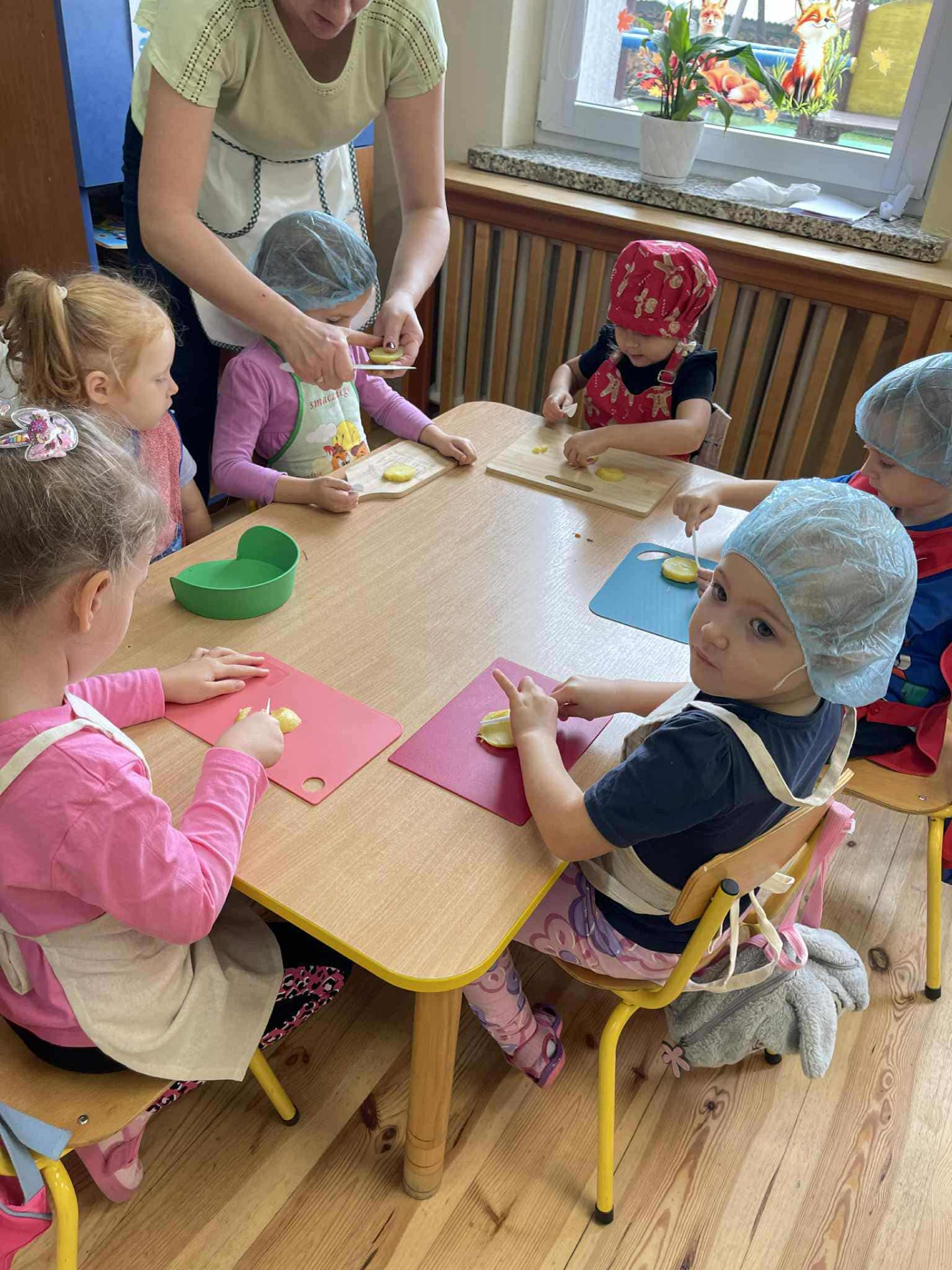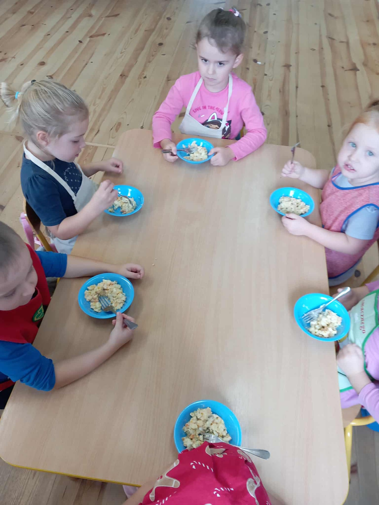 16.10.2025r. w nawiązaniu do zajęć o zdrowym odżywianiu, zrobiliśmy sałatkę jarzynową. Podczas krojenia marchewek, ziemniaków, ogórków i innych warzyw zachowaliśmy podstawowe zasady higieny i bezpieczeństwa. Ubrani w kolorowe fartuszki samodzielnie obraliśmy i starannie pokroiliśmy składniki. Gdy sałatka była gotowa, wspólnie usiedliśmy do drugiego śniadania. Świetnie się bawiliśmy, a jeszcze lepiej najedliśmy.