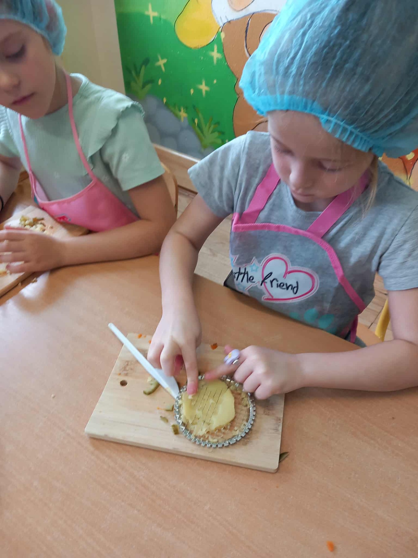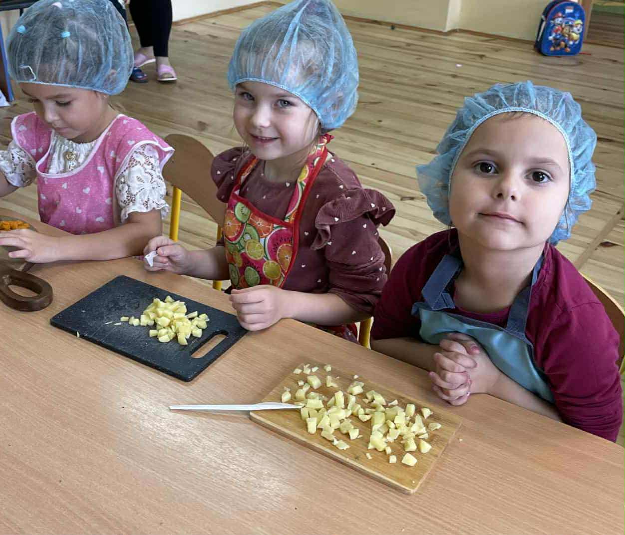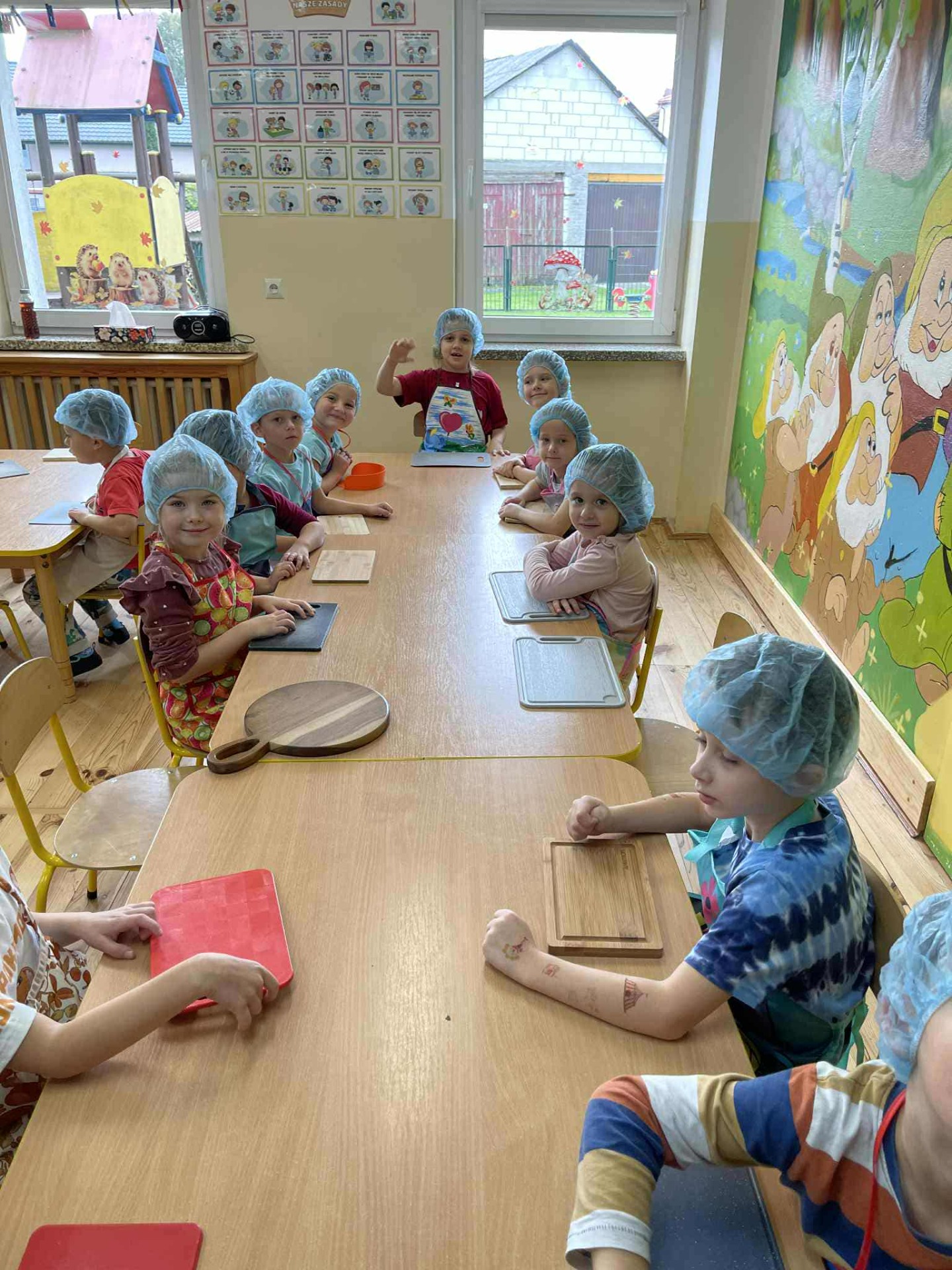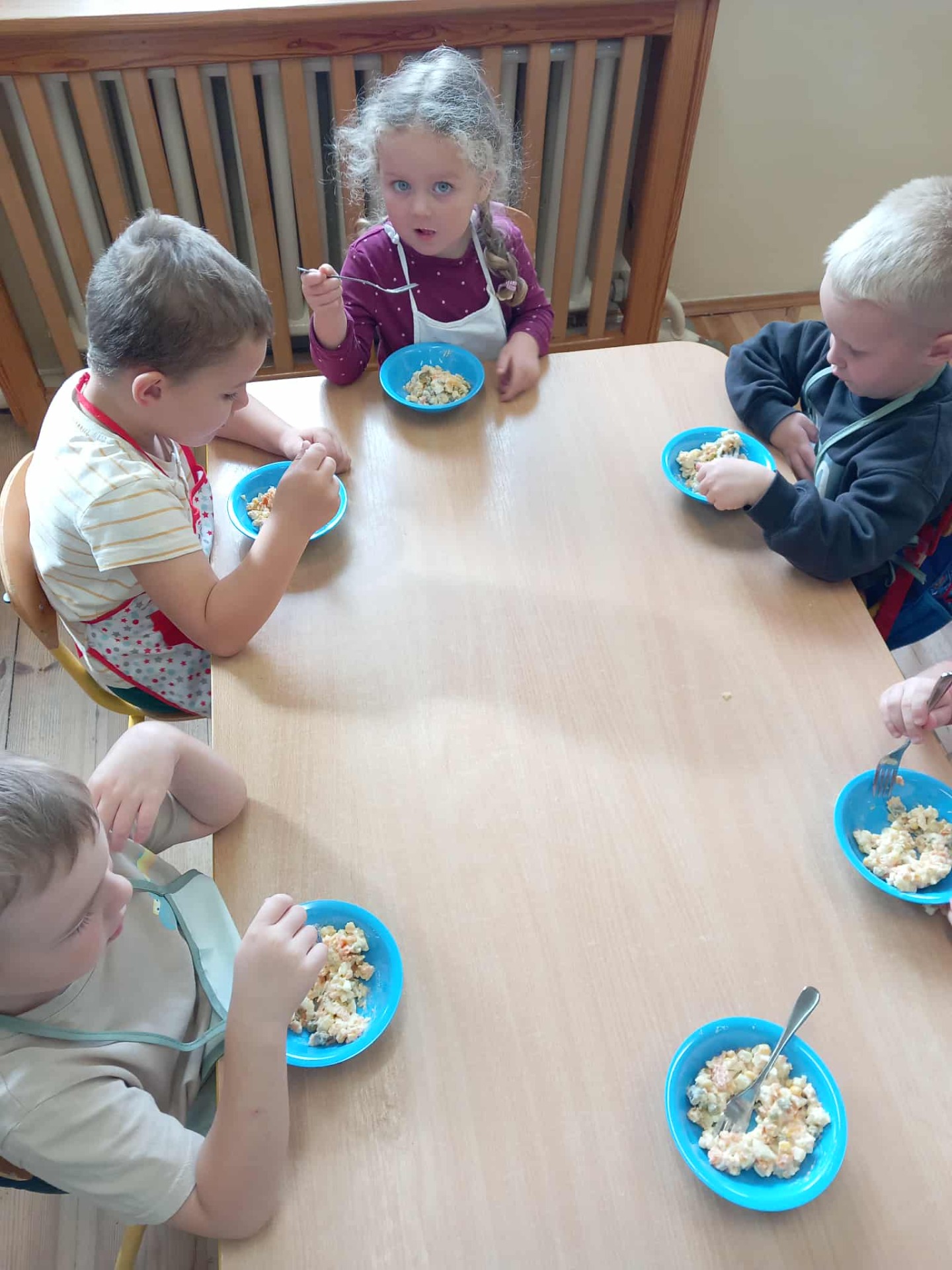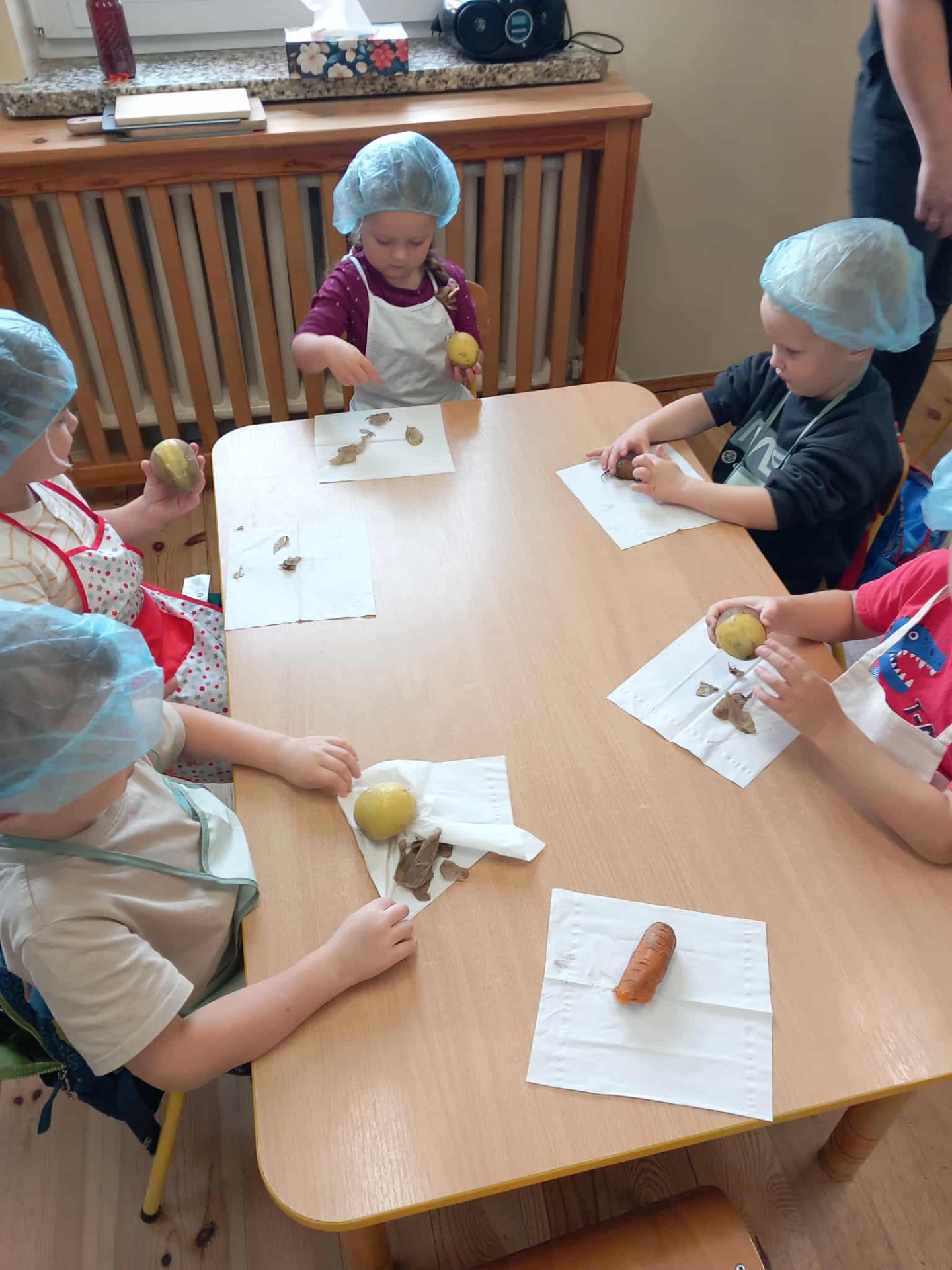 16.10.2025r. w nawiązaniu do zajęć o zdrowym odżywianiu, zrobiliśmy sałatkę jarzynową. Podczas krojenia marchewek, ziemniaków, ogórków i innych warzyw zachowaliśmy podstawowe zasady higieny i bezpieczeństwa. Ubrani w kolorowe fartuszki samodzielnie obraliśmy i starannie pokroiliśmy składniki. Gdy sałatka była gotowa, wspólnie usiedliśmy do drugiego śniadania. Świetnie się bawiliśmy, a jeszcze lepiej najedliśmy.