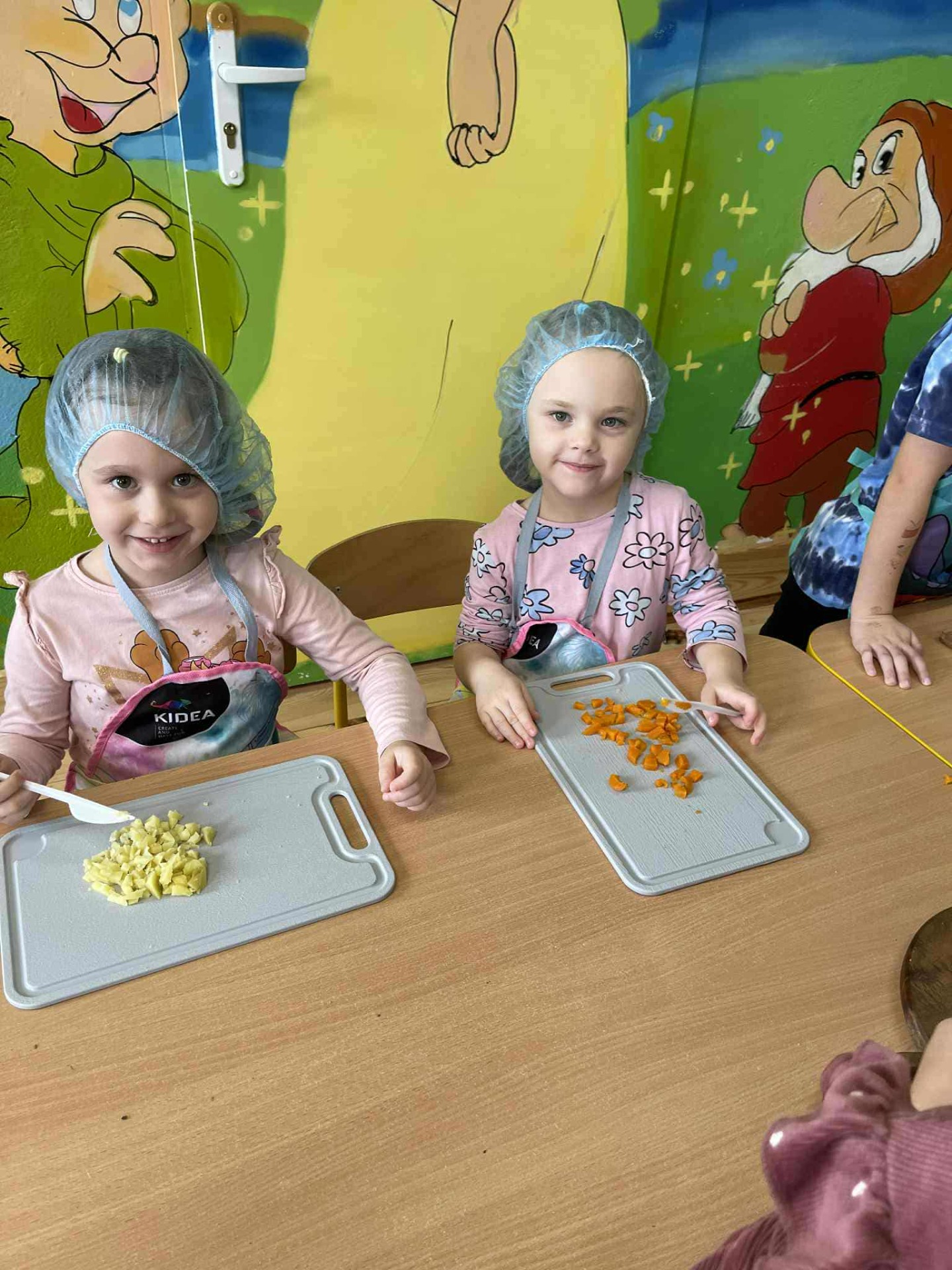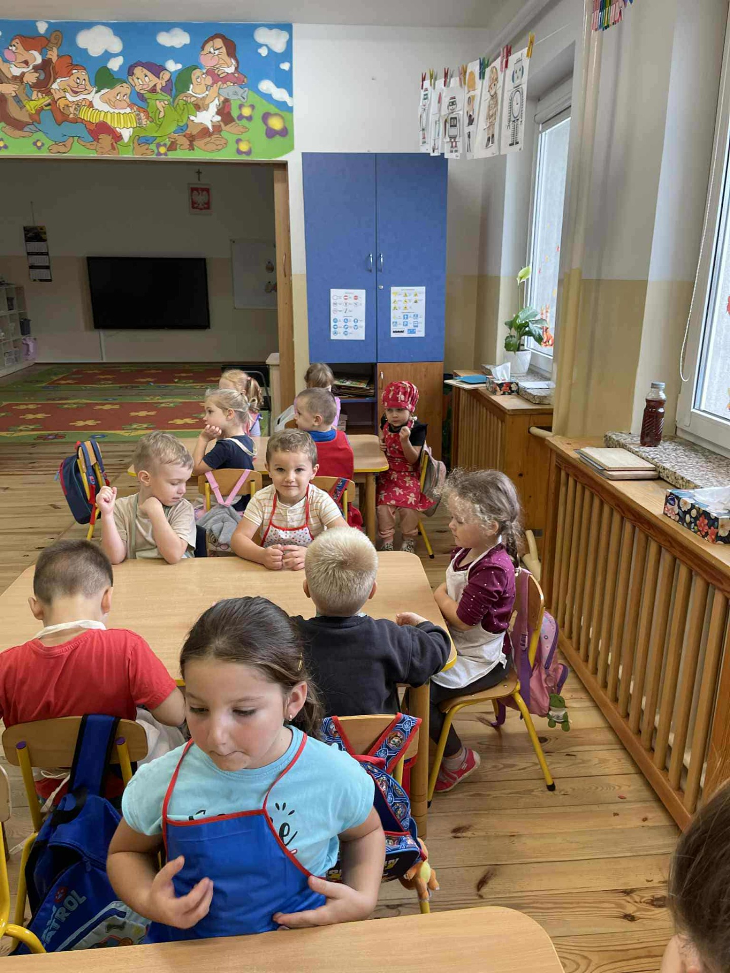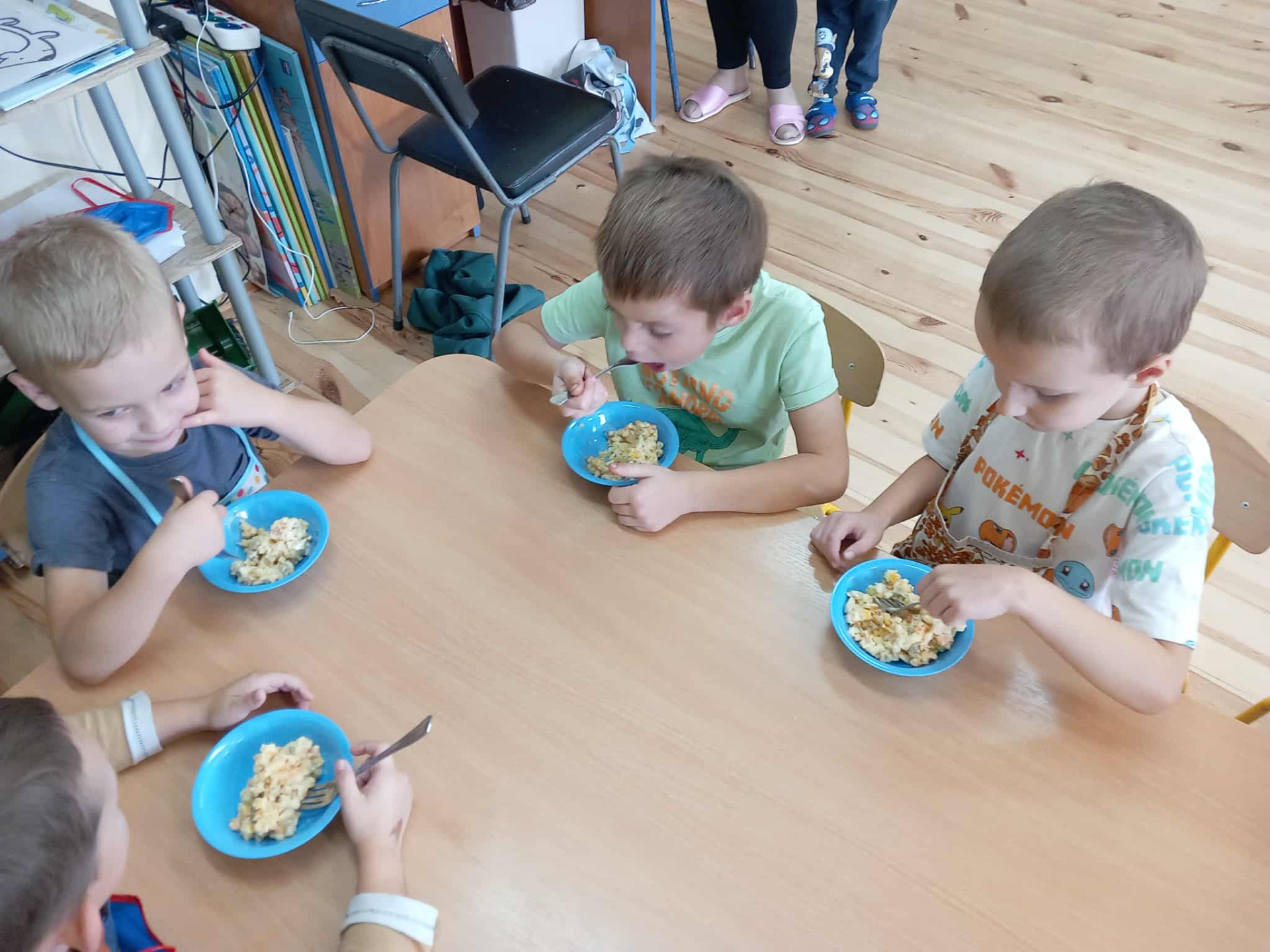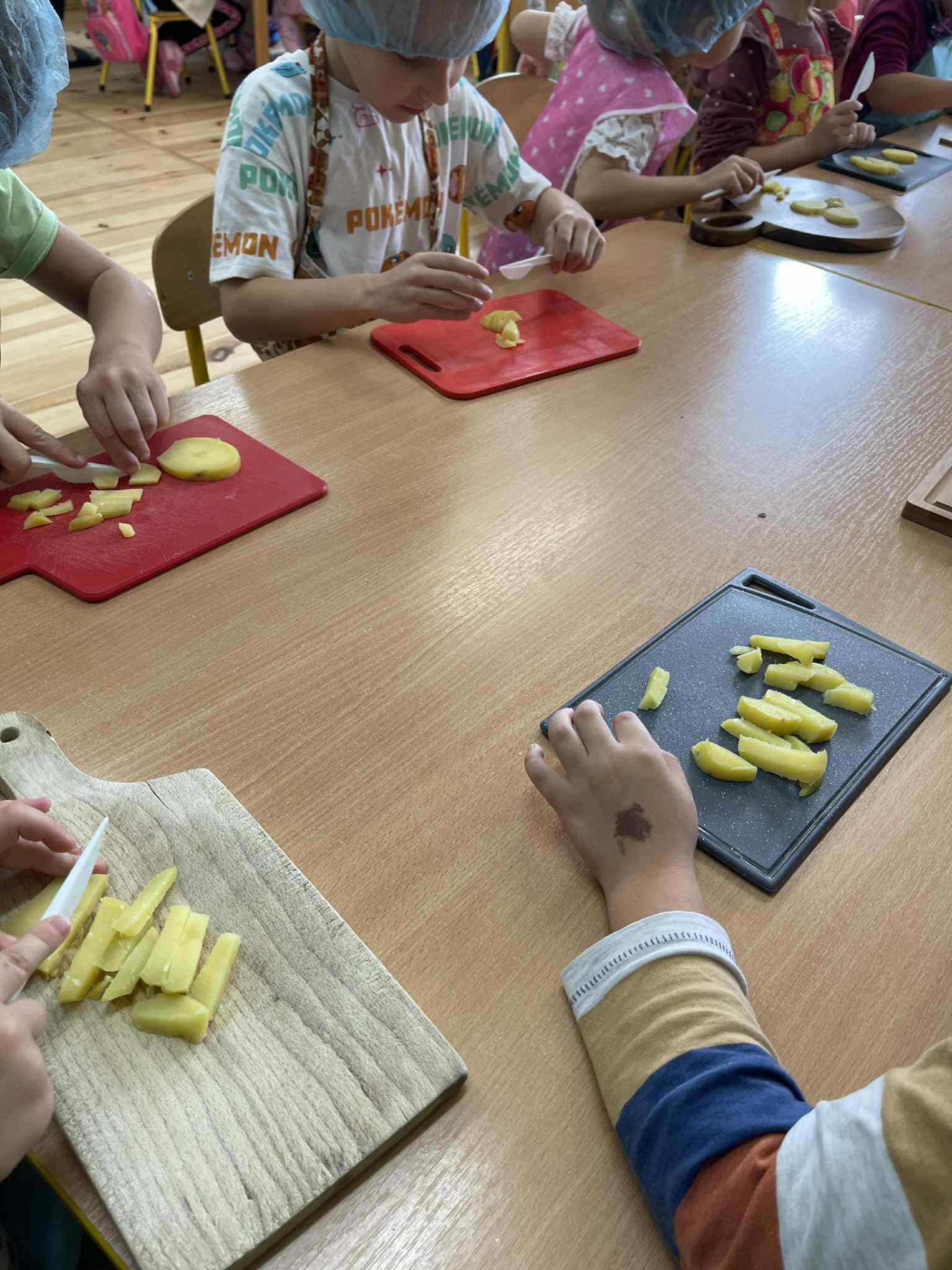 16.10.2025r. w nawiązaniu do zajęć o zdrowym odżywianiu, zrobiliśmy sałatkę jarzynową. Podczas krojenia marchewek, ziemniaków, ogórków i innych warzyw zachowaliśmy podstawowe zasady higieny i bezpieczeństwa. Ubrani w kolorowe fartuszki samodzielnie obraliśmy i starannie pokroiliśmy składniki. Gdy sałatka była gotowa, wspólnie usiedliśmy do drugiego śniadania. Świetnie się bawiliśmy, a jeszcze lepiej najedliśmy.