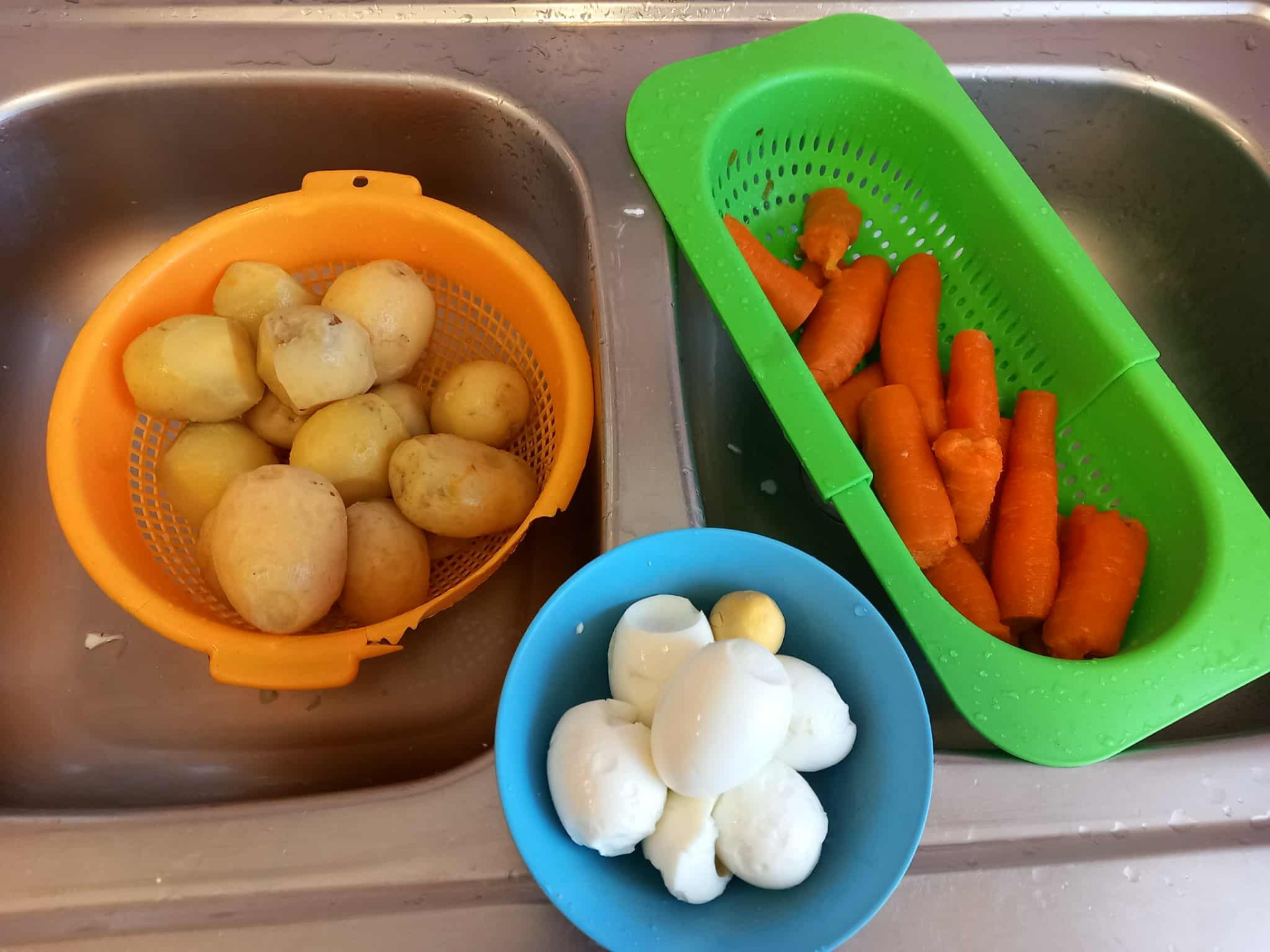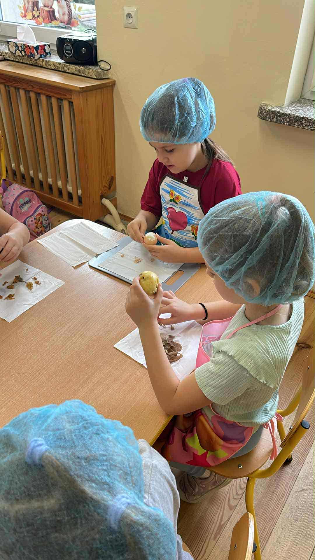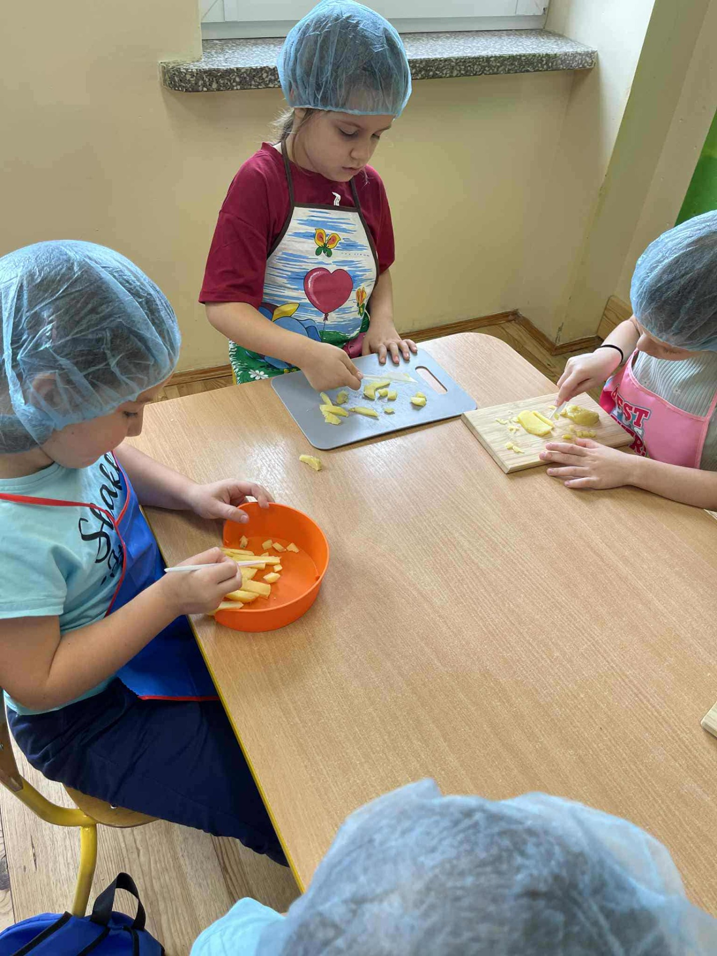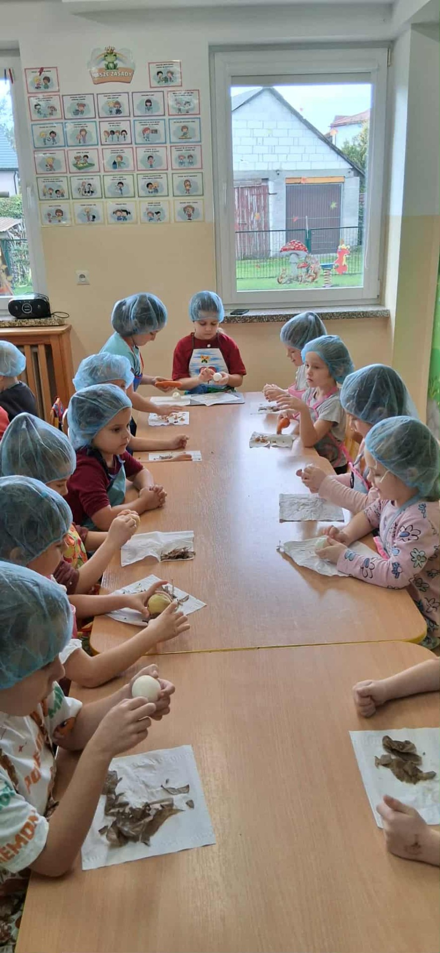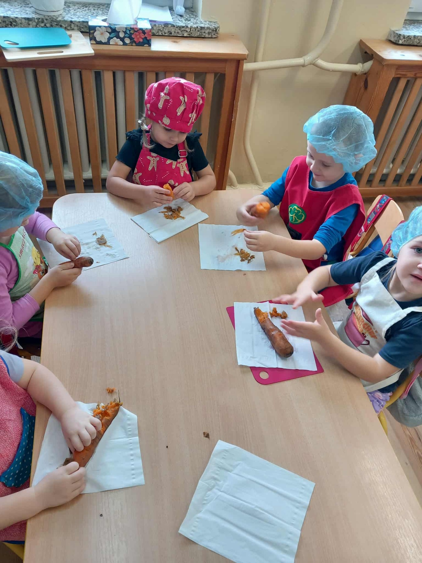 16.10.2025r. w nawiązaniu do zajęć o zdrowym odżywianiu, zrobiliśmy sałatkę jarzynową. Podczas krojenia marchewek, ziemniaków, ogórków i innych warzyw zachowaliśmy podstawowe zasady higieny i bezpieczeństwa. Ubrani w kolorowe fartuszki samodzielnie obraliśmy i starannie pokroiliśmy składniki. Gdy sałatka była gotowa, wspólnie usiedliśmy do drugiego śniadania. Świetnie się bawiliśmy, a jeszcze lepiej najedliśmy.