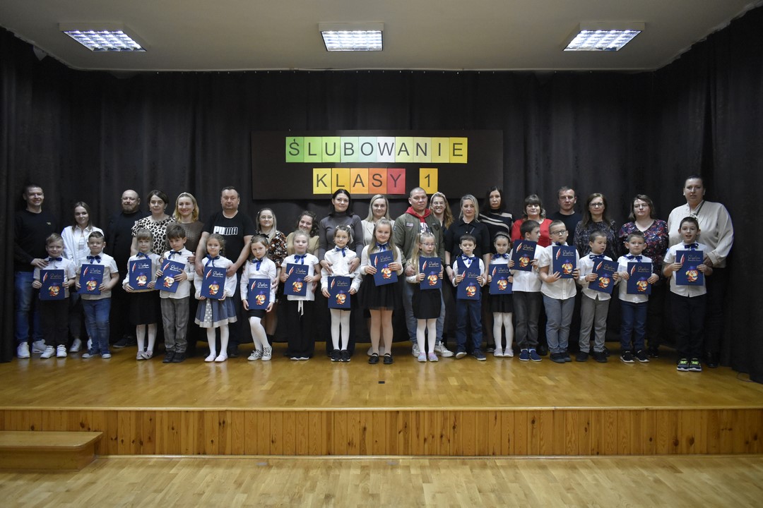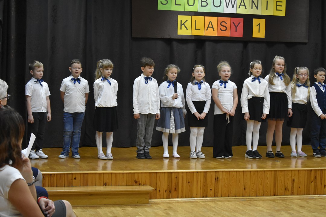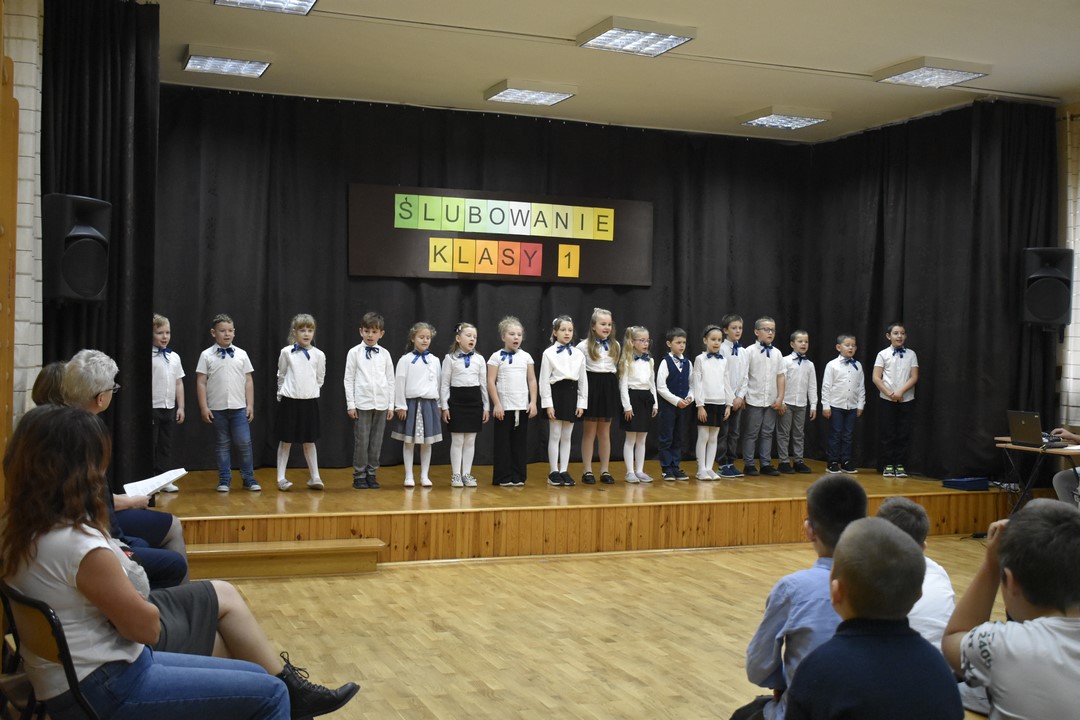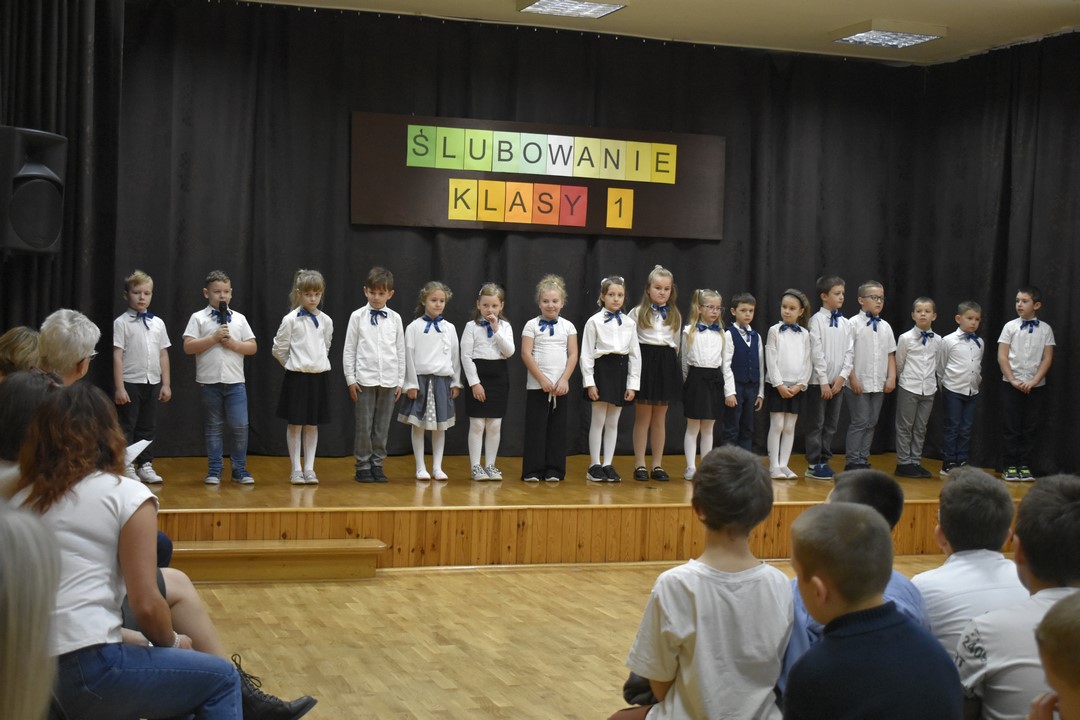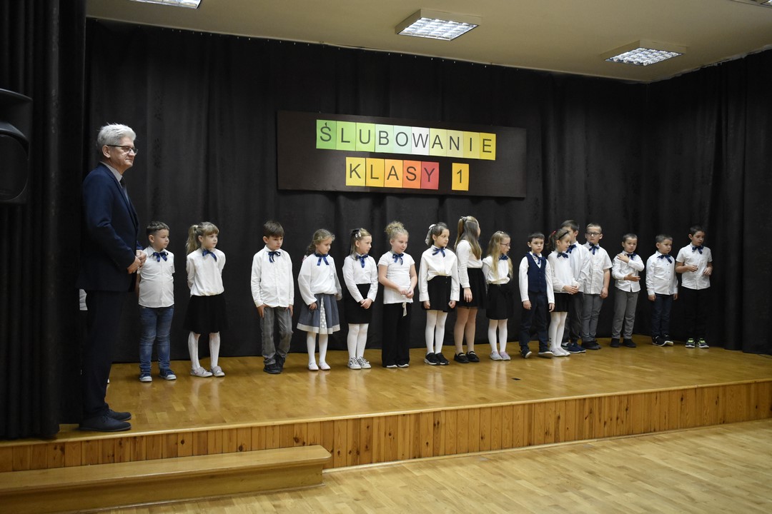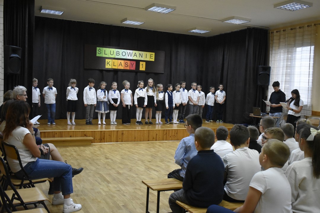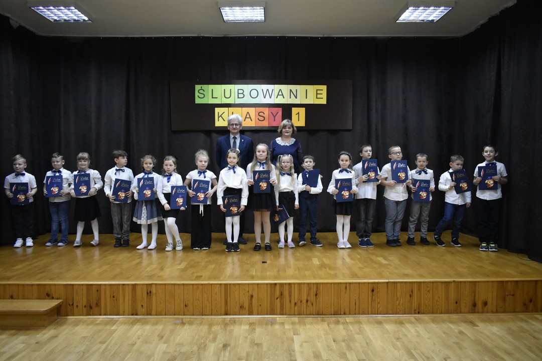 Dnia 24 października 2025r. odbyło się uroczyste ślubowanie i pasowanie uczniów klasy pierwszej. Po kilku tygodniach poznawania norm i zasad panujących w naszej szkole, poznania historii i tradycji szkoły oraz wyuczeniu się wielu wierszyków i piosenek uczniowie byli gotowi przystąpić do tak ważnego wydarzenia. Ślubowanie złożyło 17 uczniów. Po dokonaniu pasowania przez p. Dyrektora uczniowie otrzymali pamiątkowe dyplomy oraz słodkie upominki od rodziców.