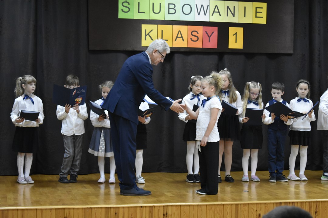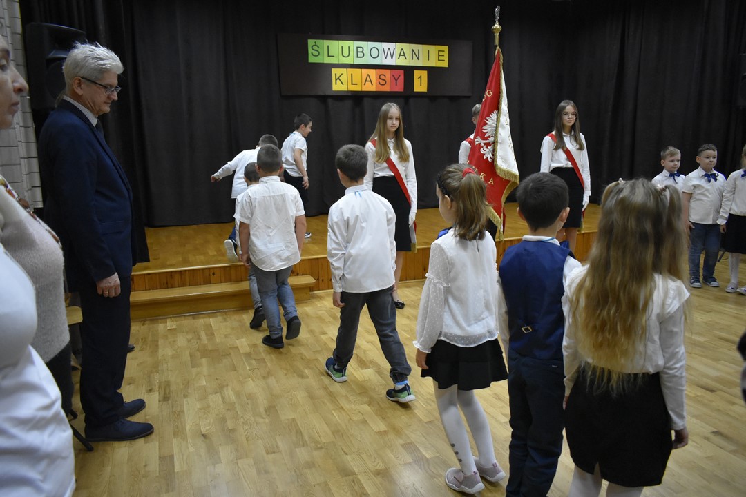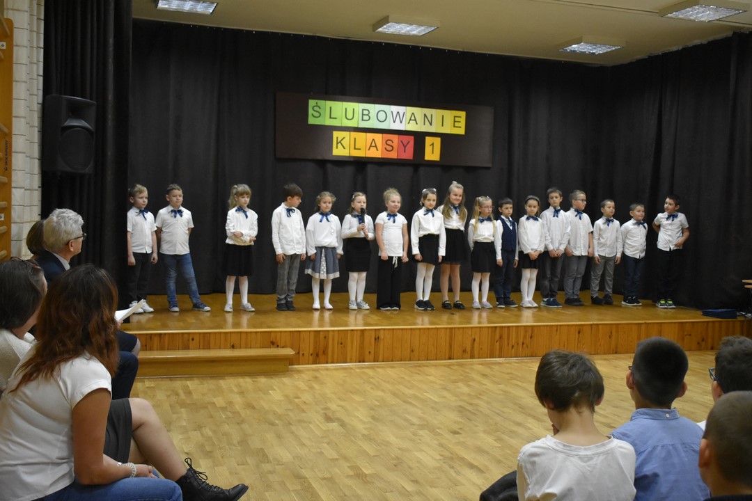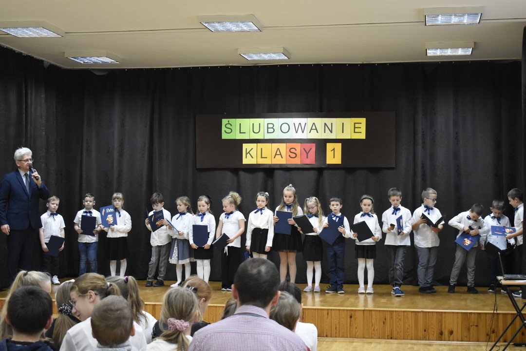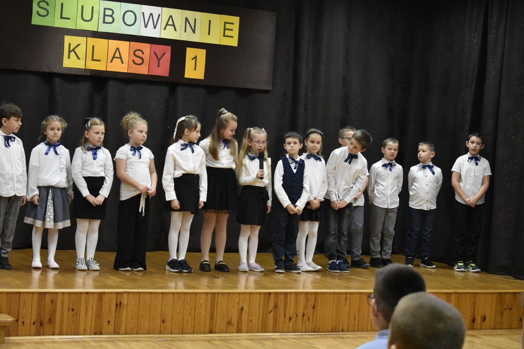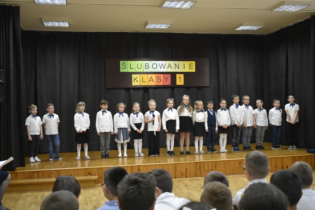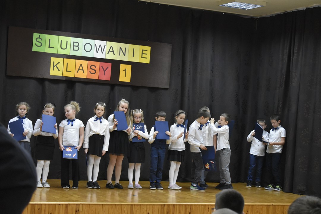 Dnia 24 października 2025r. odbyło się uroczyste ślubowanie i pasowanie uczniów klasy pierwszej. Po kilku tygodniach poznawania norm i zasad panujących w naszej szkole, poznania historii i tradycji szkoły oraz wyuczeniu się wielu wierszyków i piosenek uczniowie byli gotowi przystąpić do tak ważnego wydarzenia. Ślubowanie złożyło 17 uczniów. Po dokonaniu pasowania przez p. Dyrektora uczniowie otrzymali pamiątkowe dyplomy oraz słodkie upominki od rodziców.