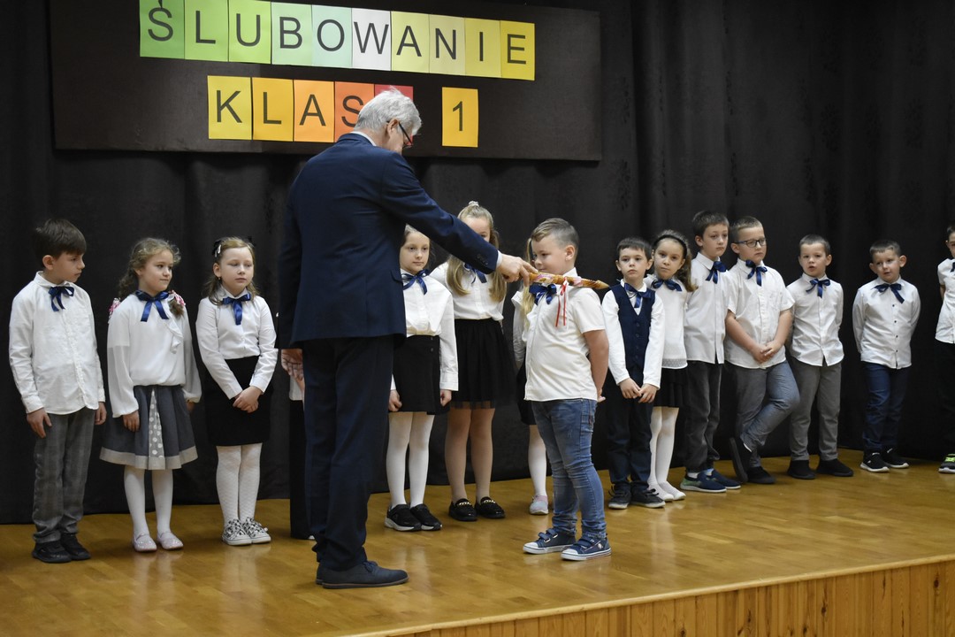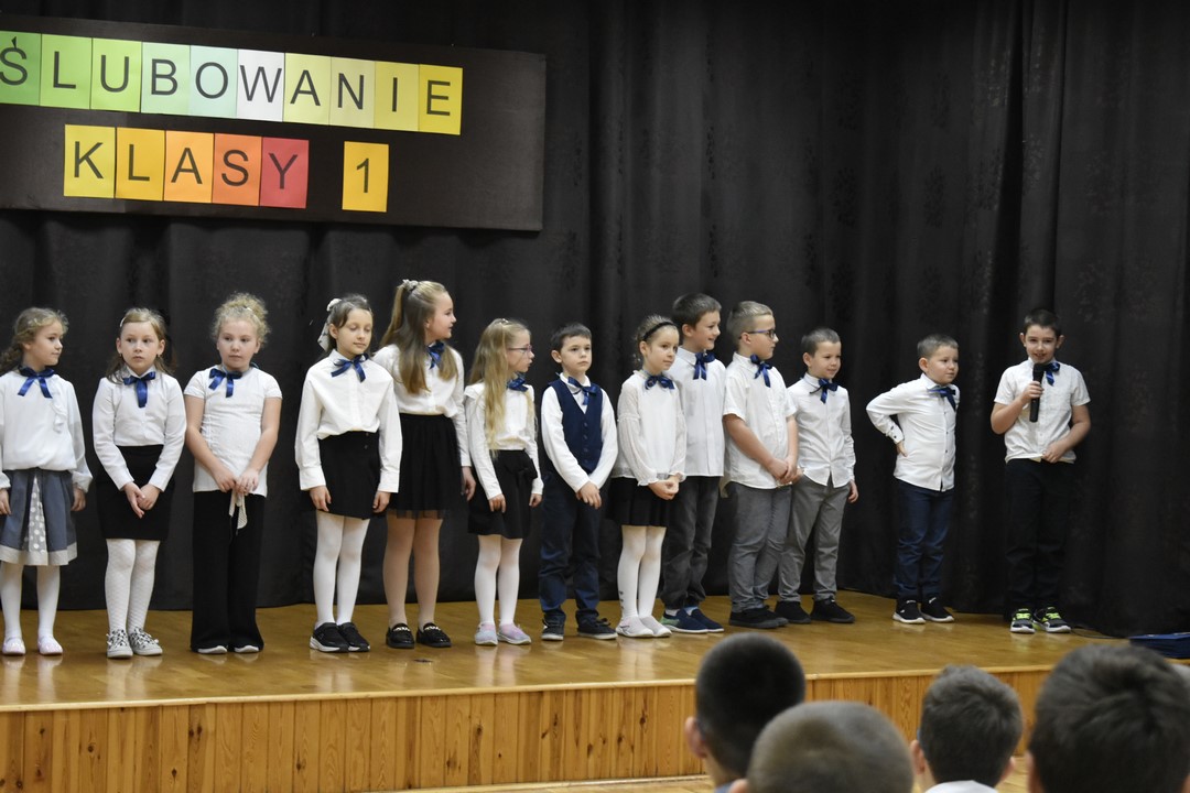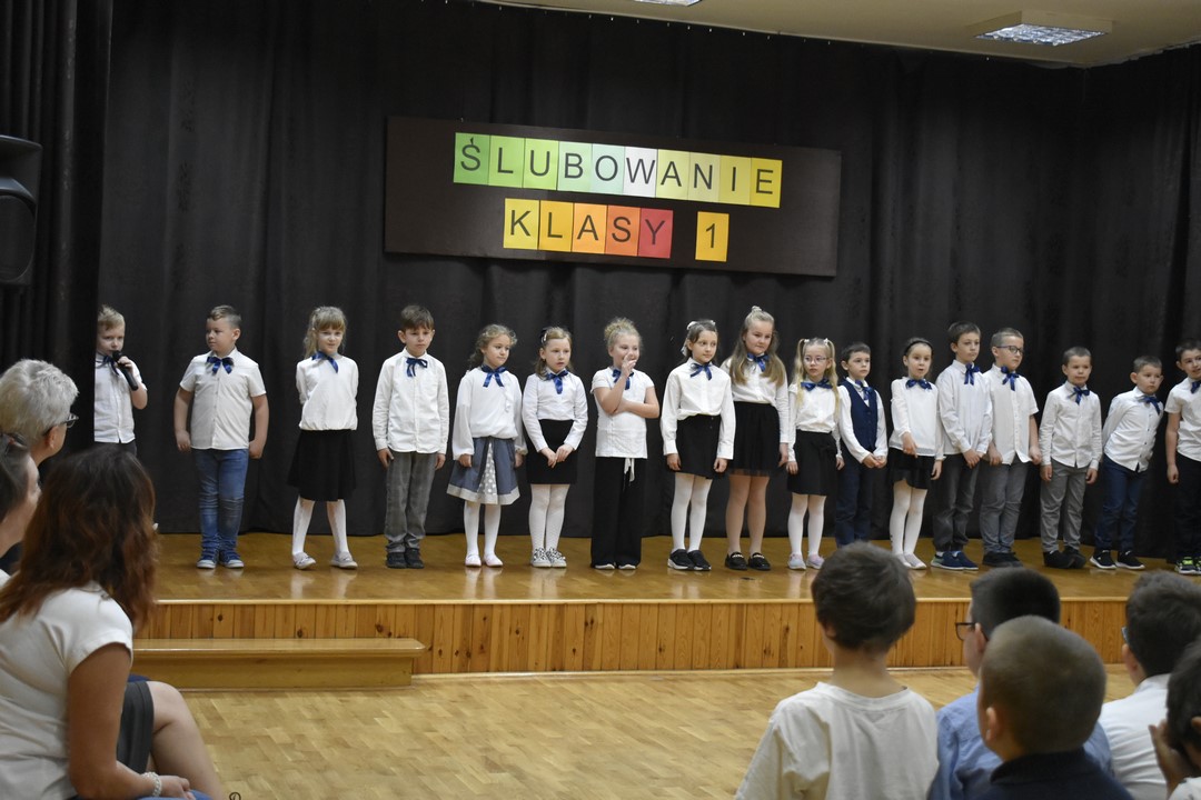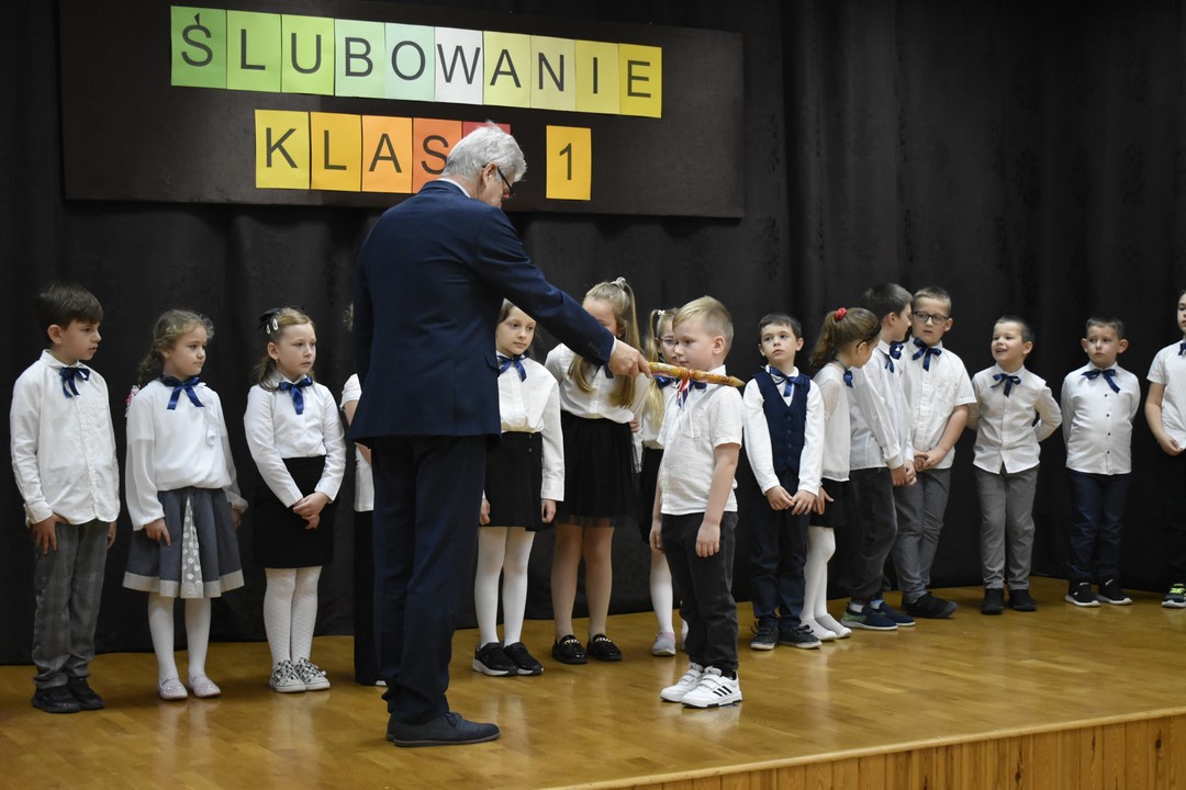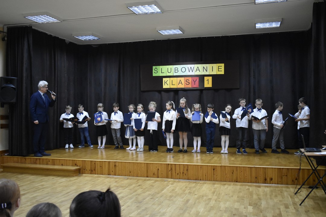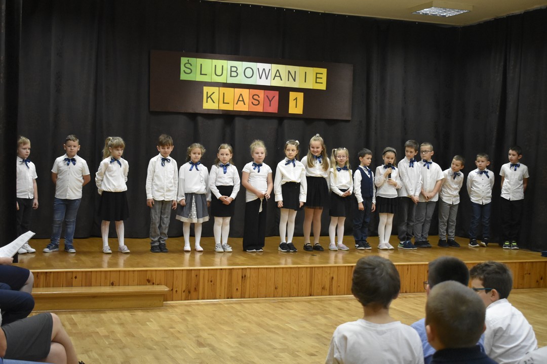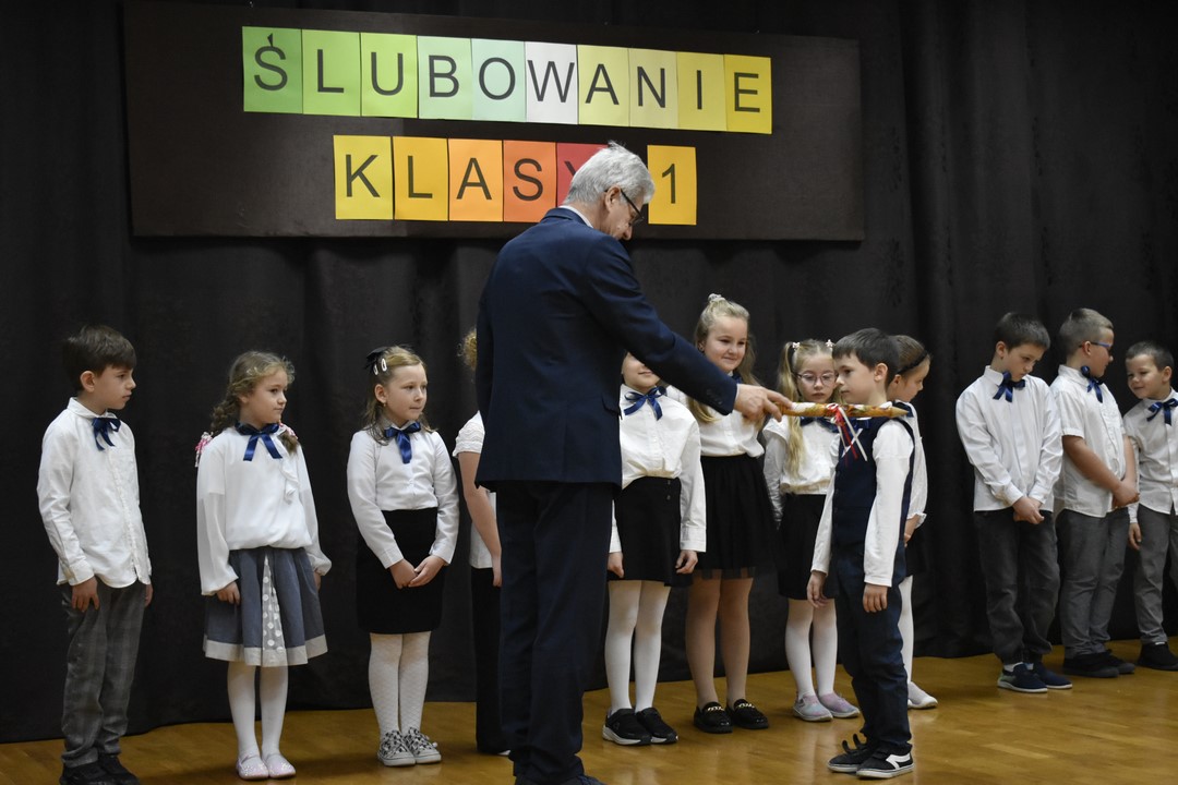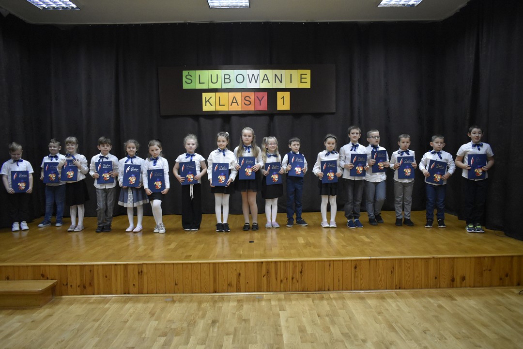 Dnia 24 października 2025r. odbyło się uroczyste ślubowanie i pasowanie uczniów klasy pierwszej. Po kilku tygodniach poznawania norm i zasad panujących w naszej szkole, poznania historii i tradycji szkoły oraz wyuczeniu się wielu wierszyków i piosenek uczniowie byli gotowi przystąpić do tak ważnego wydarzenia. Ślubowanie złożyło 17 uczniów. Po dokonaniu pasowania przez p. Dyrektora uczniowie otrzymali pamiątkowe dyplomy oraz słodkie upominki od rodziców.