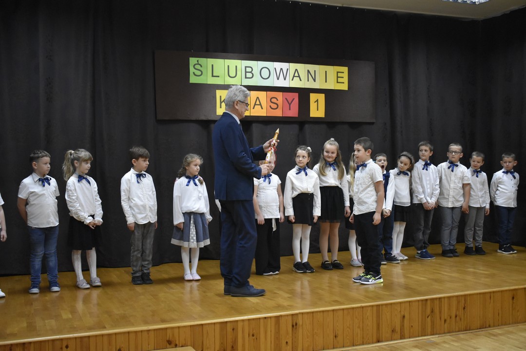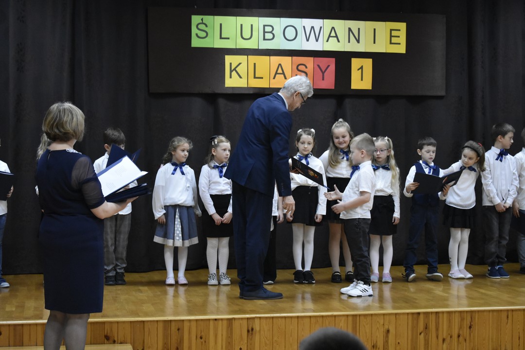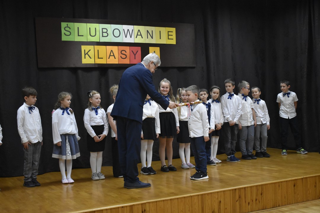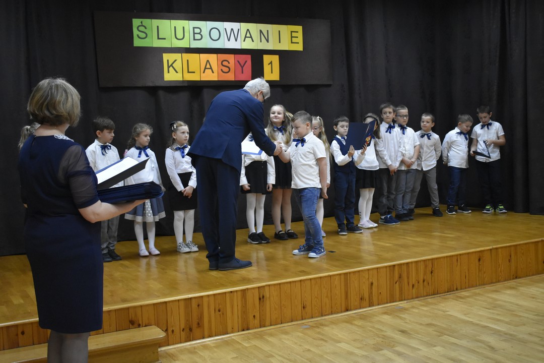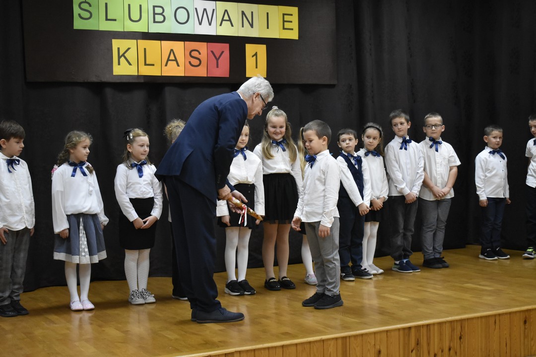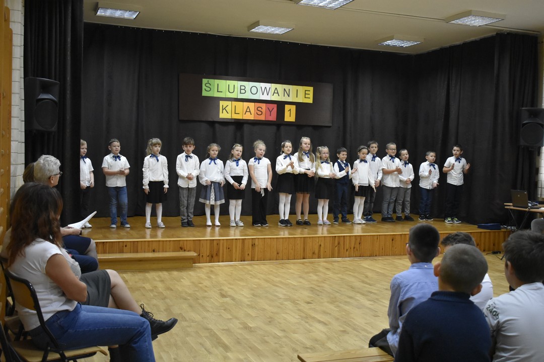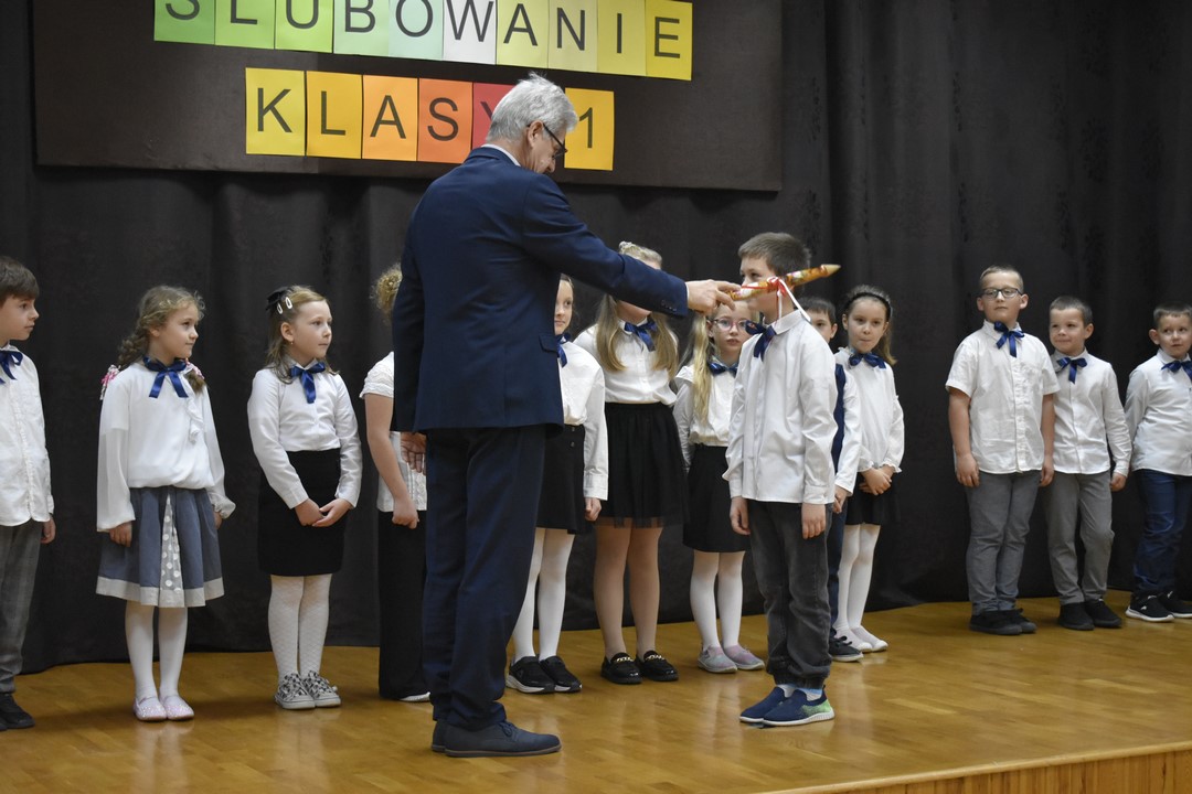 Dnia 24 października 2025r. odbyło się uroczyste ślubowanie i pasowanie uczniów klasy pierwszej. Po kilku tygodniach poznawania norm i zasad panujących w naszej szkole, poznania historii i tradycji szkoły oraz wyuczeniu się wielu wierszyków i piosenek uczniowie byli gotowi przystąpić do tak ważnego wydarzenia. Ślubowanie złożyło 17 uczniów. Po dokonaniu pasowania przez p. Dyrektora uczniowie otrzymali pamiątkowe dyplomy oraz słodkie upominki od rodziców.