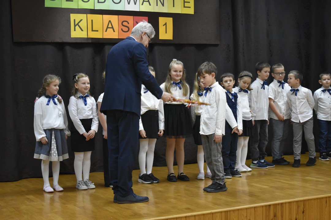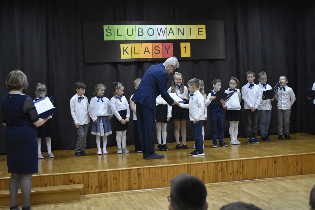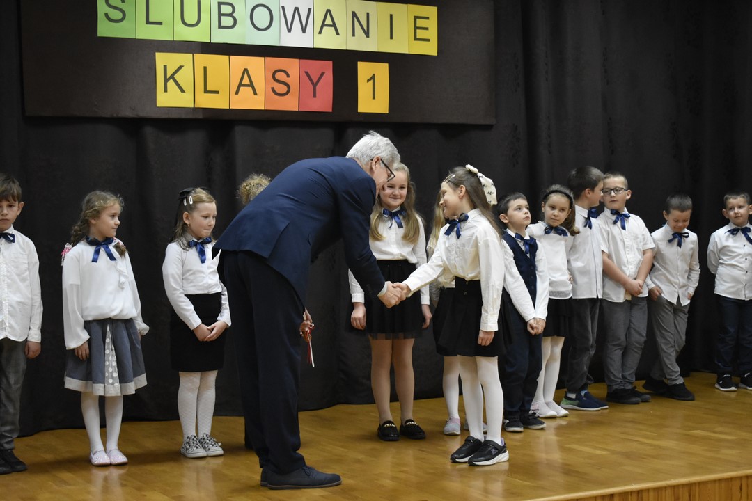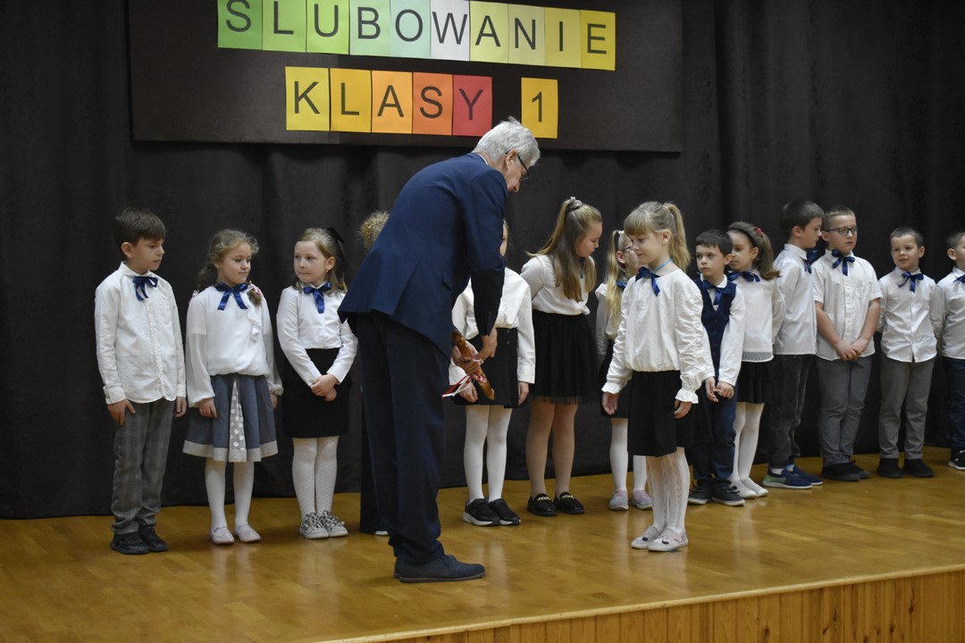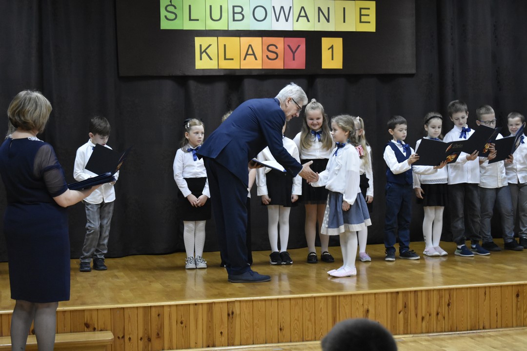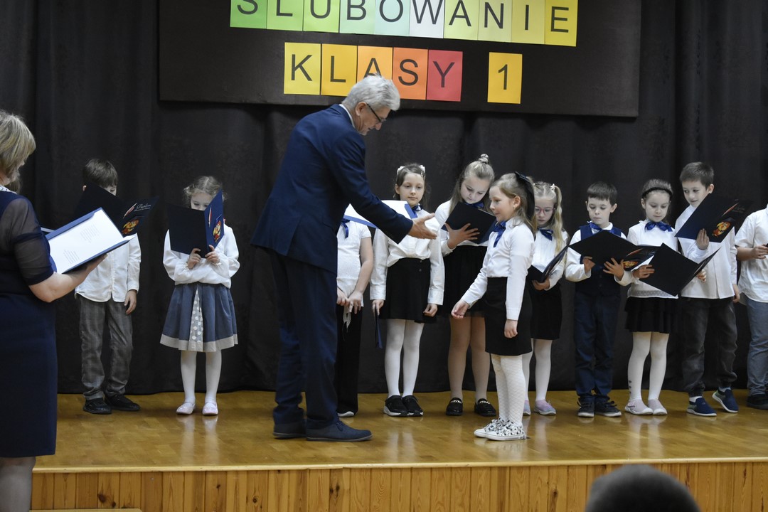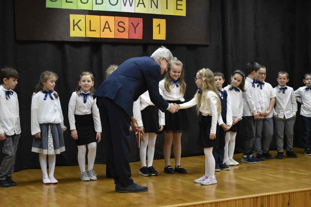 Dnia 24 października 2025r. odbyło się uroczyste ślubowanie i pasowanie uczniów klasy pierwszej. Po kilku tygodniach poznawania norm i zasad panujących w naszej szkole, poznania historii i tradycji szkoły oraz wyuczeniu się wielu wierszyków i piosenek uczniowie byli gotowi przystąpić do tak ważnego wydarzenia. Ślubowanie złożyło 17 uczniów. Po dokonaniu pasowania przez p. Dyrektora uczniowie otrzymali pamiątkowe dyplomy oraz słodkie upominki od rodziców.