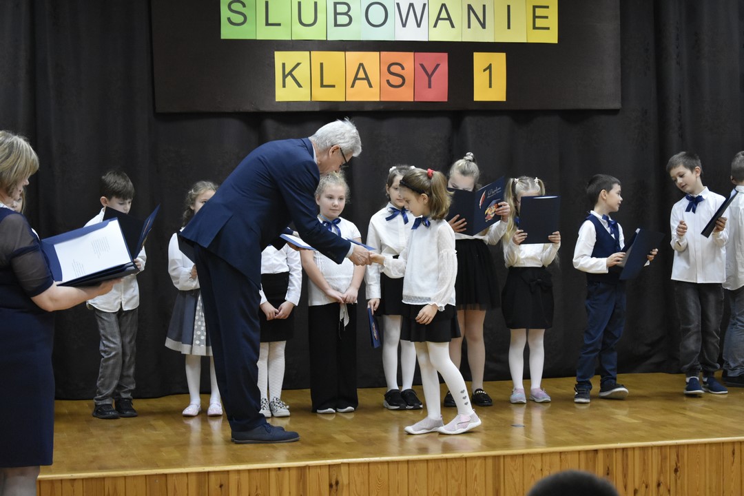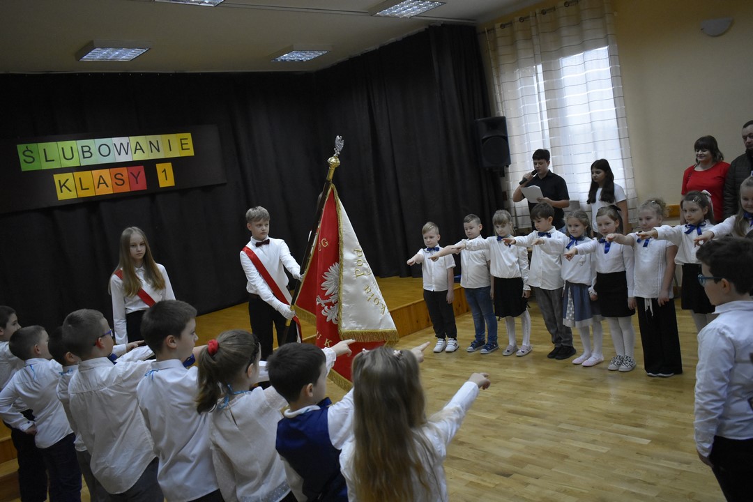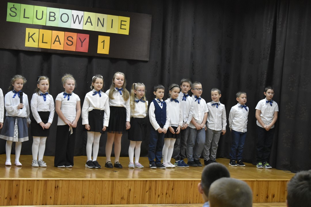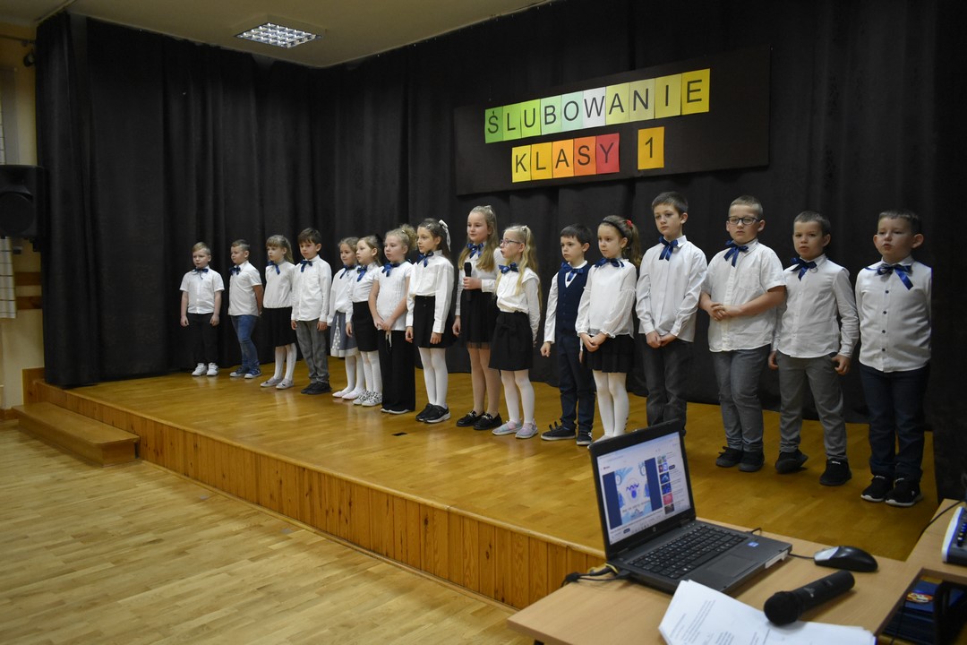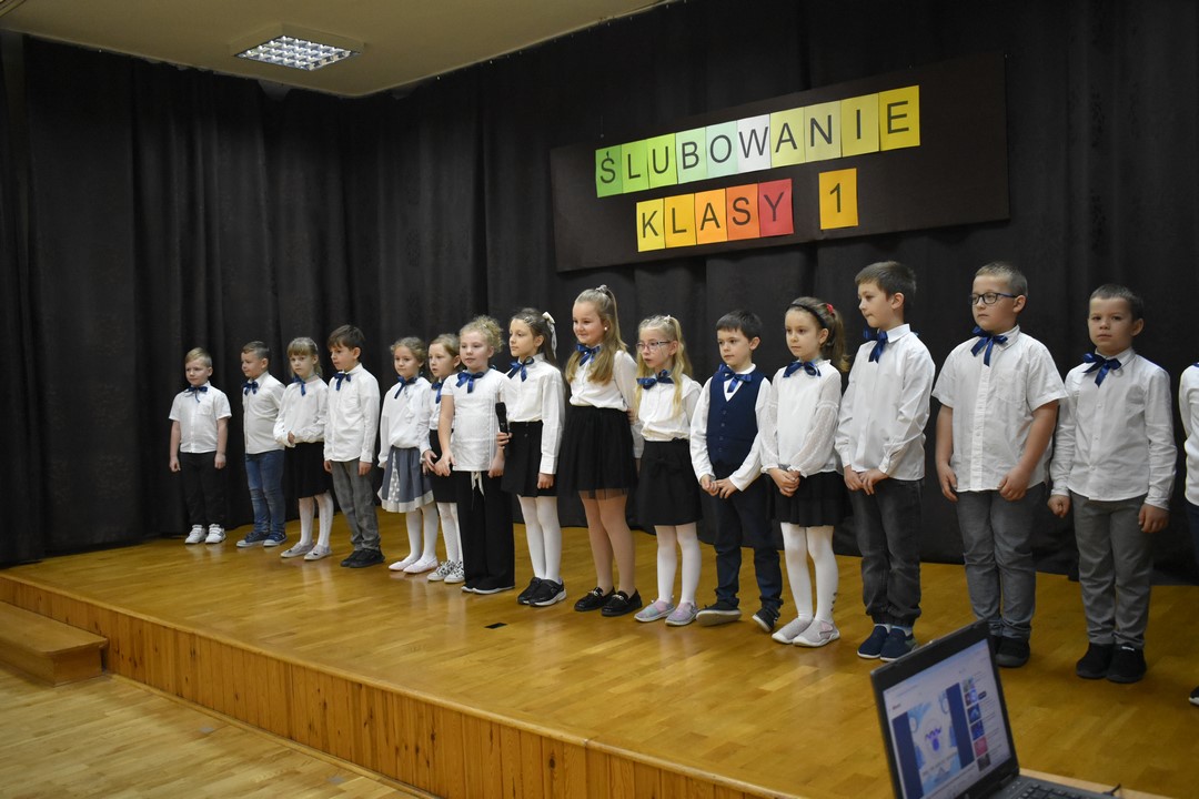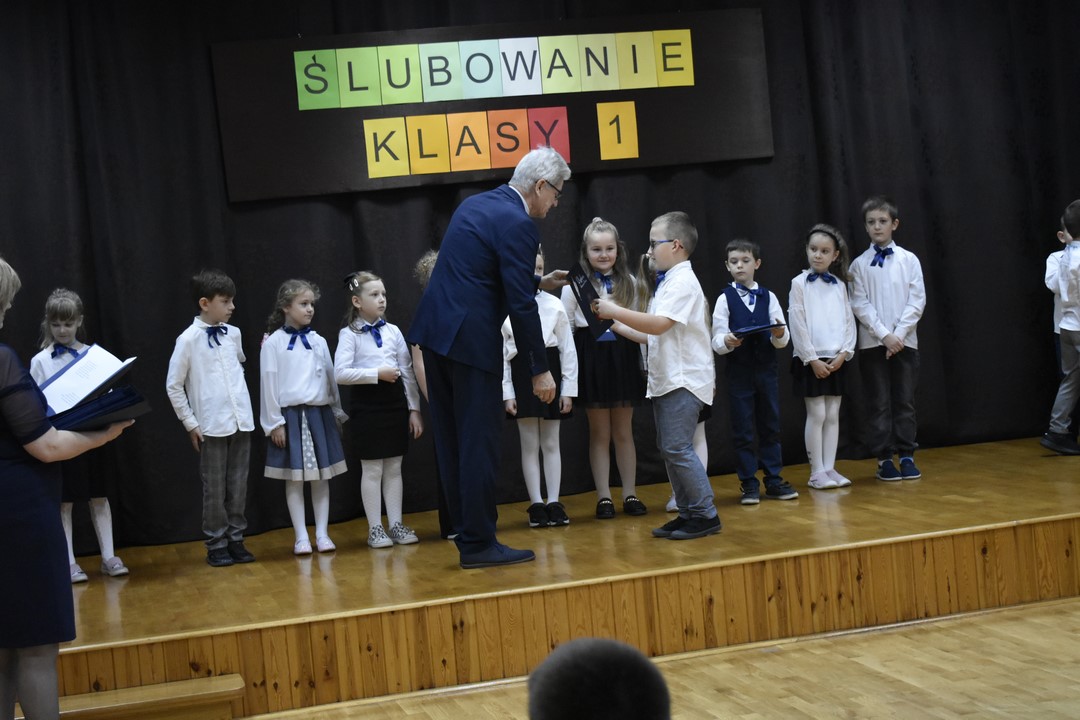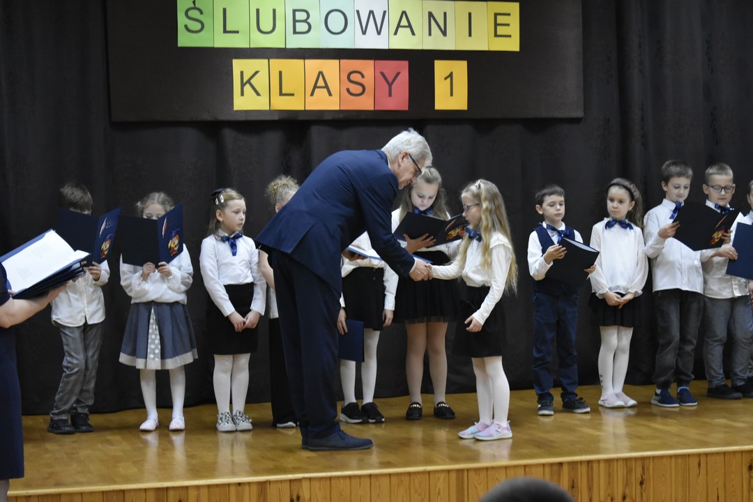 Dnia 24 października 2025r. odbyło się uroczyste ślubowanie i pasowanie uczniów klasy pierwszej. Po kilku tygodniach poznawania norm i zasad panujących w naszej szkole, poznania historii i tradycji szkoły oraz wyuczeniu się wielu wierszyków i piosenek uczniowie byli gotowi przystąpić do tak ważnego wydarzenia. Ślubowanie złożyło 17 uczniów. Po dokonaniu pasowania przez p. Dyrektora uczniowie otrzymali pamiątkowe dyplomy oraz słodkie upominki od rodziców.