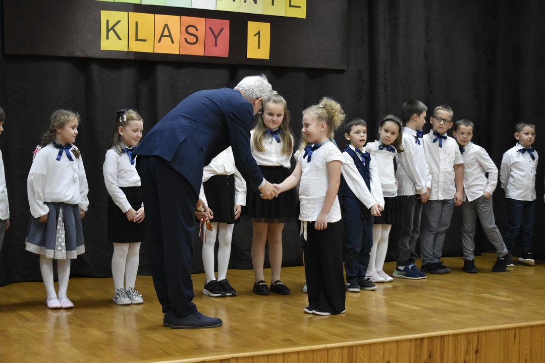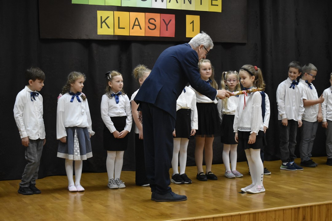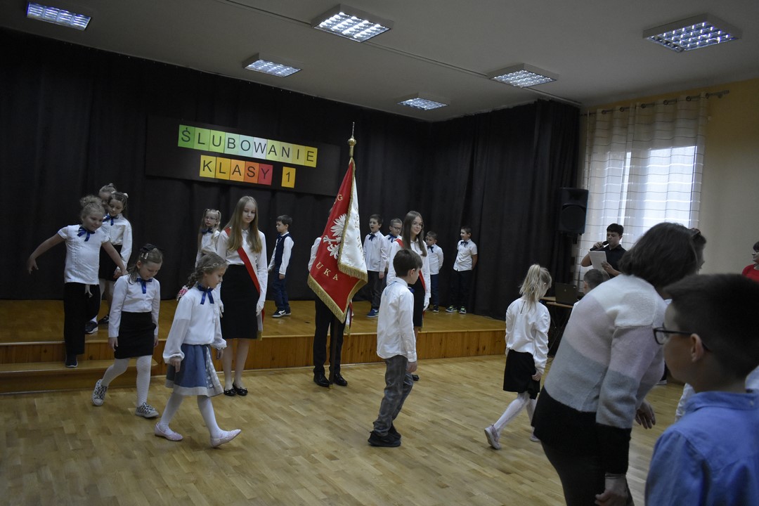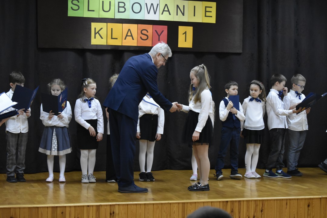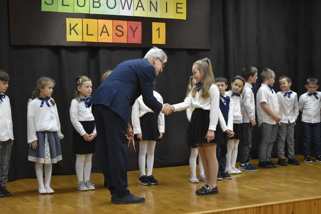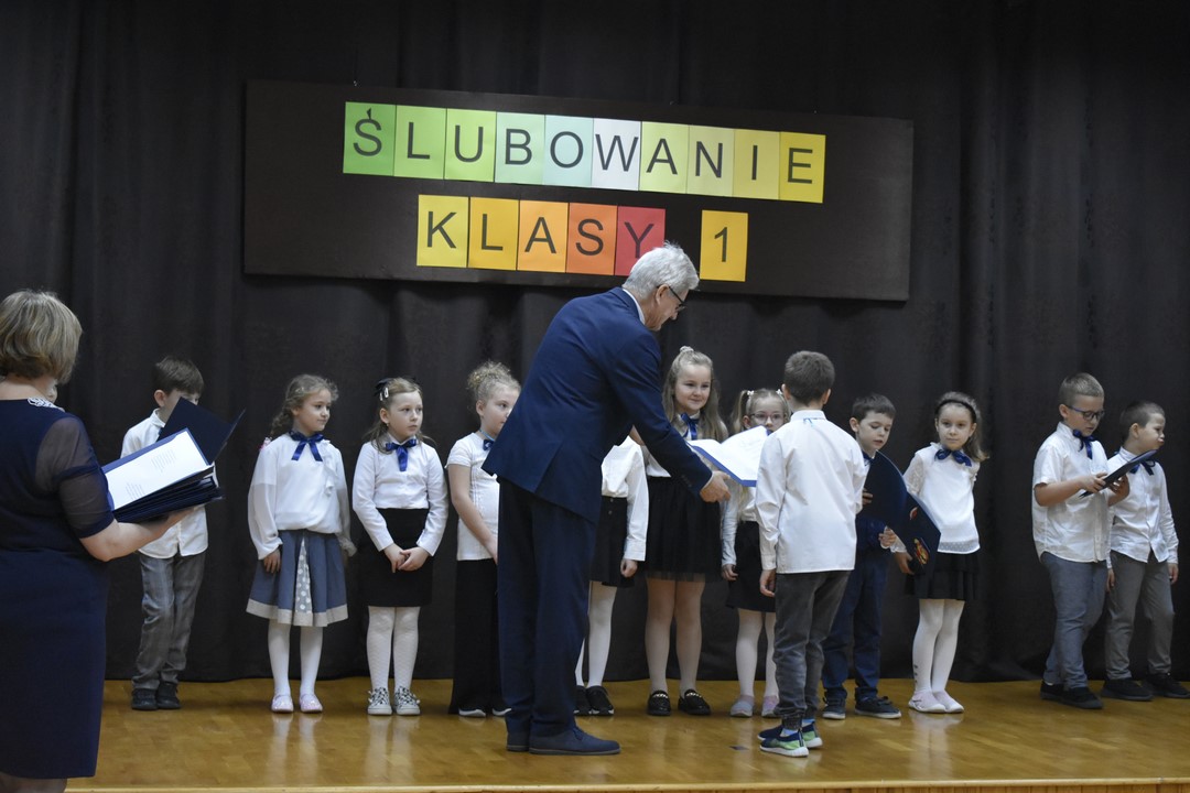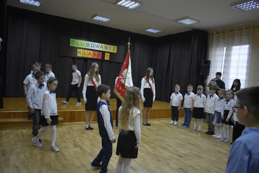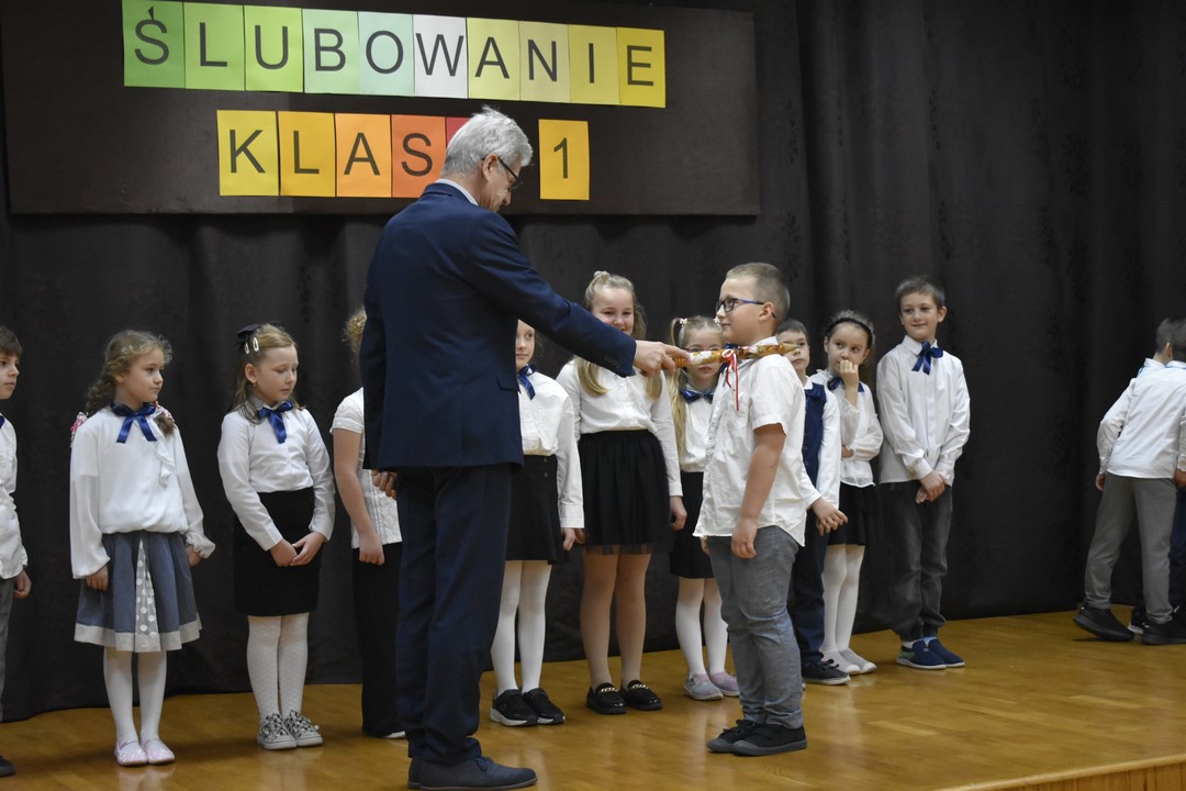 Dnia 24 października 2025r. odbyło się uroczyste ślubowanie i pasowanie uczniów klasy pierwszej. Po kilku tygodniach poznawania norm i zasad panujących w naszej szkole, poznania historii i tradycji szkoły oraz wyuczeniu się wielu wierszyków i piosenek uczniowie byli gotowi przystąpić do tak ważnego wydarzenia. Ślubowanie złożyło 17 uczniów. Po dokonaniu pasowania przez p. Dyrektora uczniowie otrzymali pamiątkowe dyplomy oraz słodkie upominki od rodziców.