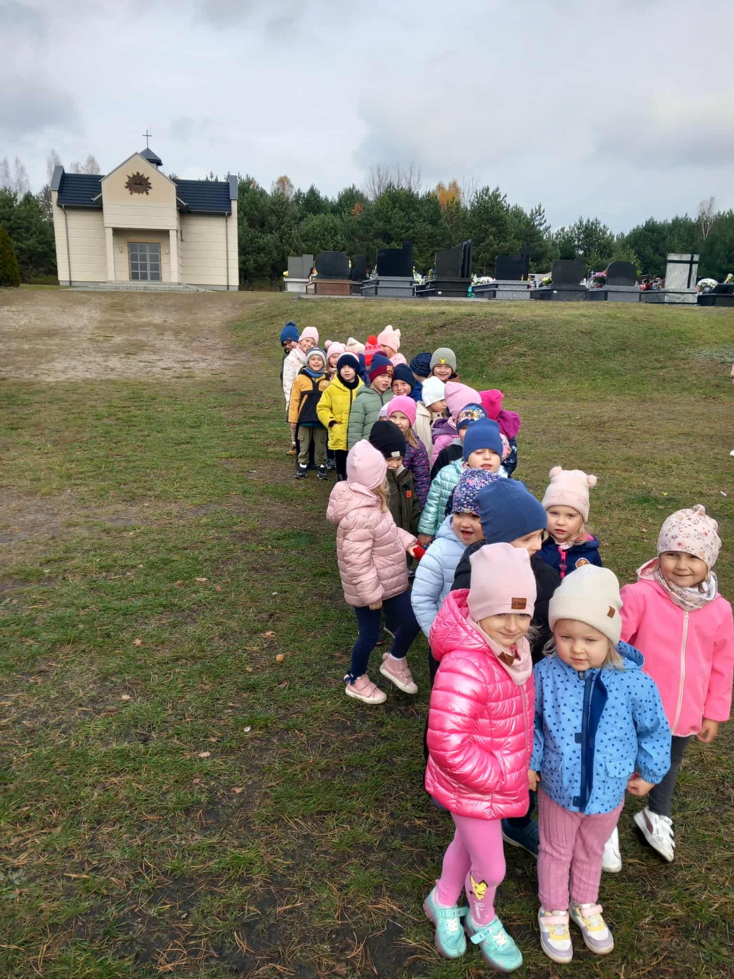 We wtorek 4 listopada dzieci z przedszkola wybrały się na Cmentarz. Zapaliły znicze i chwilą ciszy uczciły pamięć o zmarłych. Spacer alejkami cmentarza był dla dzieci ogromnym przeżyciem, szły skupione i bardzo zaciekawione.