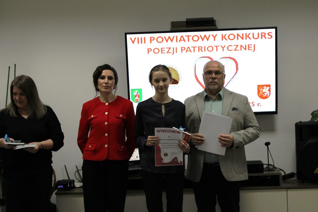 1 grudnia w Miejskiej Bibliotece Publicznej w Tomaszowie Lubelskim odbyło się wręczenie dyplomów i nagród w VIII Powiatowym Konkursie Recytatorskim Poezji Patriotycznej. W finale wiersze recytowało 130 młodych artystów, a 67 osób zostało nagrodzonych. Wśród nich znalazła się uczennica klasy VII – Magdalena Próchnicka otrzymując WYRÓŻNIENIE w kategorii klas VII-VIII.