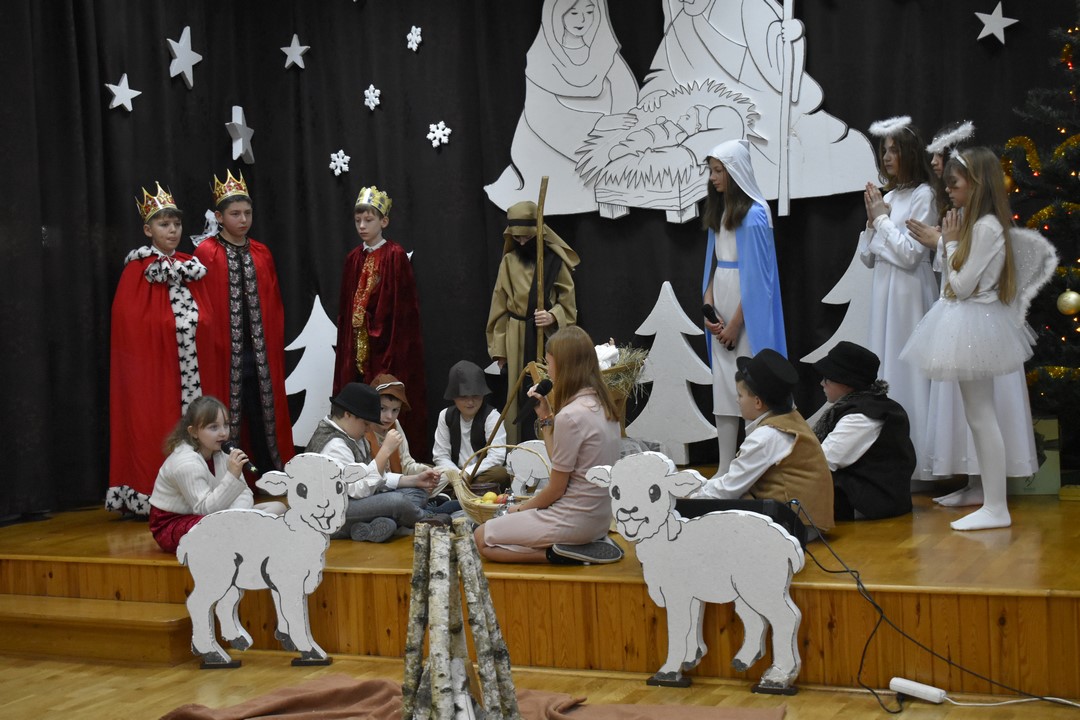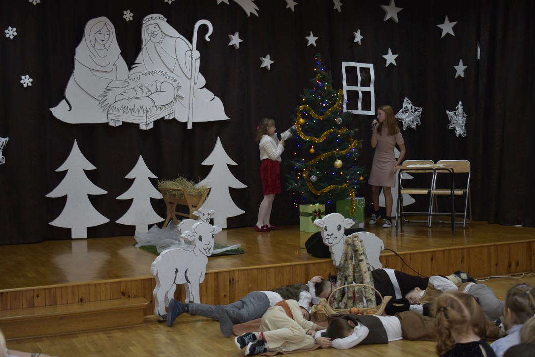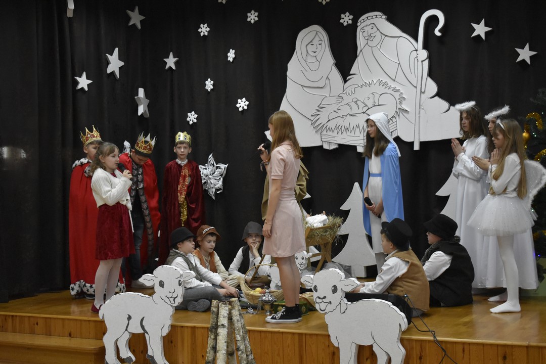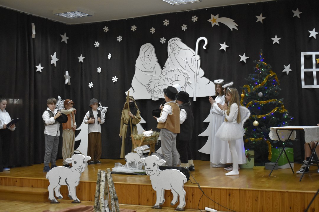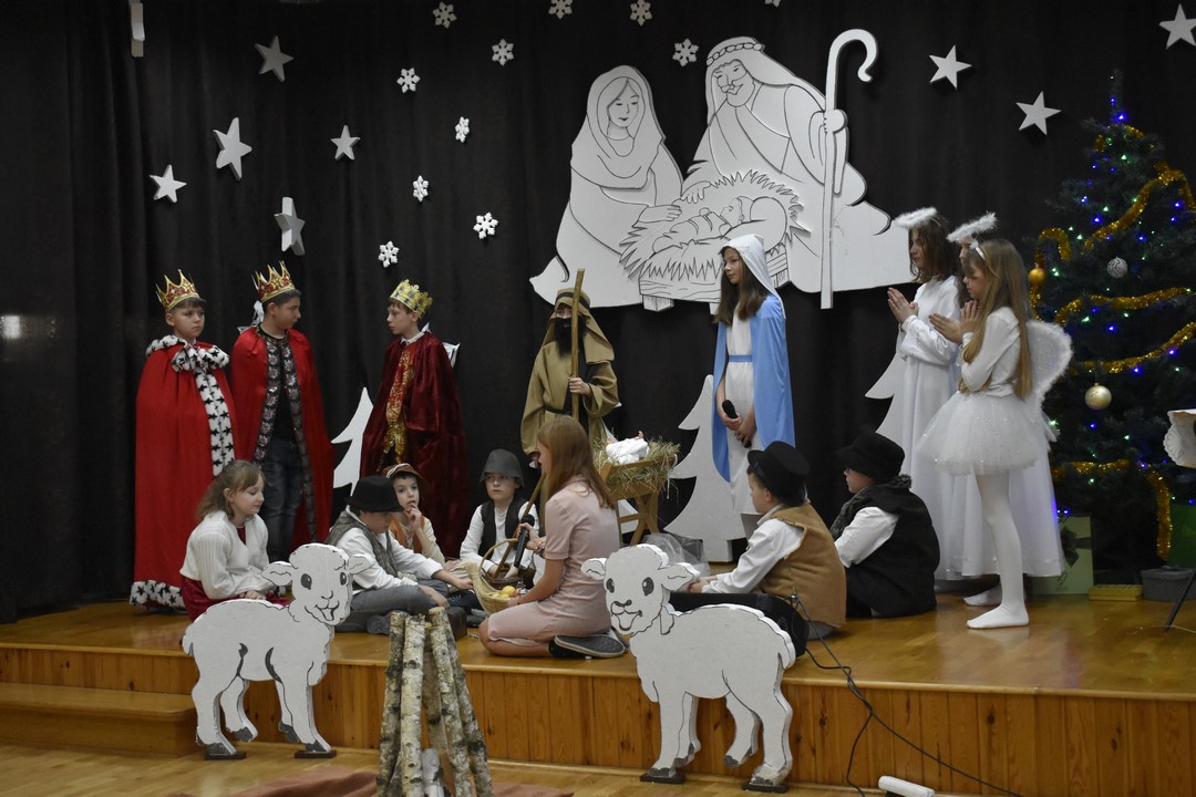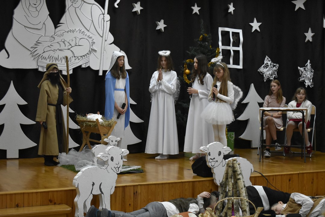 "Historia cudownej nocy"– to tytuł przedstawienia, które 19 grudnia 2025r. o godzinie 11.00 zaprezentowali uczniowie naszej szkoły. Było to widowisko niezwykłe. Artyści odgrywali różne sceny przybliżające widzom dzieje narodzin Pana Jezusa. Świetności inscenizacji dodały kolędy śpiewane przez chór szkolny, które napełniły wszystkich świąteczną radością i sprawiły, że poczuliśmy radość zbliżających się świąt.