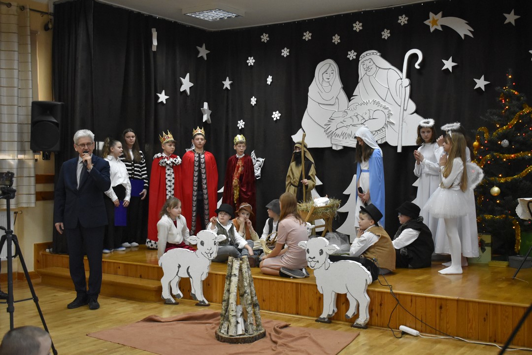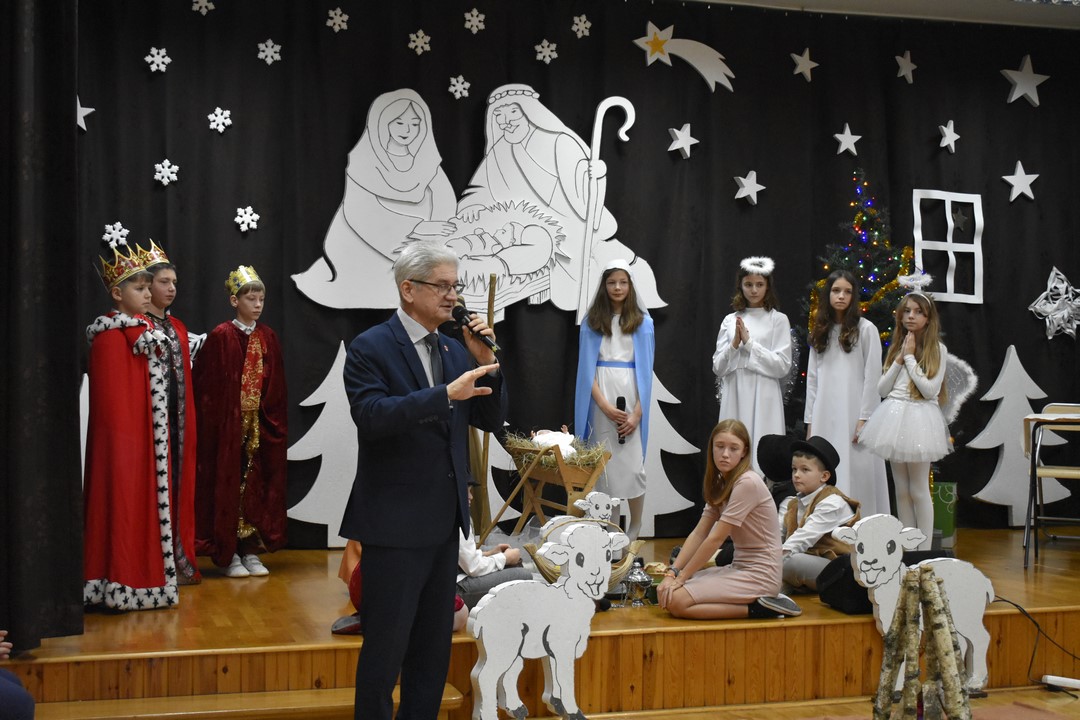 Po zakończonym spektaklu głos zabrał Pan Dyrektor, który podziękował artystom oraz ich opiekunom za przygotowanie jasełek oraz śpiew kolęd, a tym samym za wspaniałe wprowadzenie w atmosferę Świąt Bożego Narodzenia. Złożył także świąteczne życzenia wszystkim przybyłym gościom.